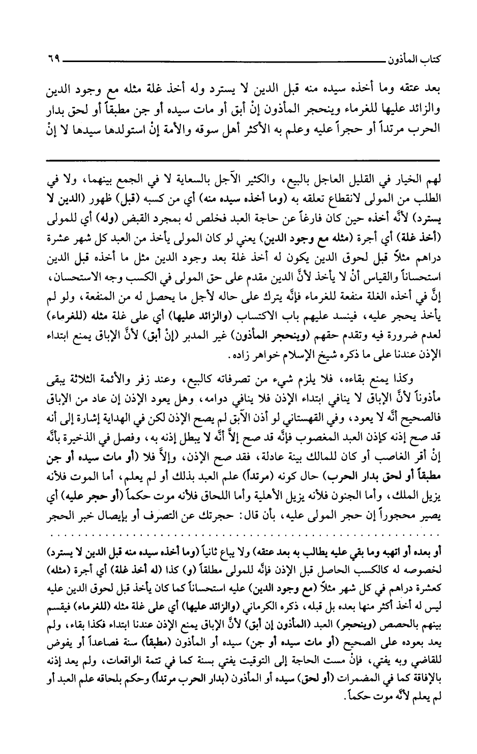 وينحجر المأذون غير المدبر إن أبق لأن الإباق يمنع ابتداء الإذن عندنا على ما ذكره شيخ الإسلام خواهر زاده وكذا يمنع بقاءه فلا يلزم شيء من تصرفاته كالبيع وعند زفر والأئمة الثلاثة يبقى مأذونا لأن الإباق لا ينافي ابتداء الإذن فلا ينافي دوامه وهل يعود الإذن إن عاد من الإباق فالصحيح أنه لا يعود