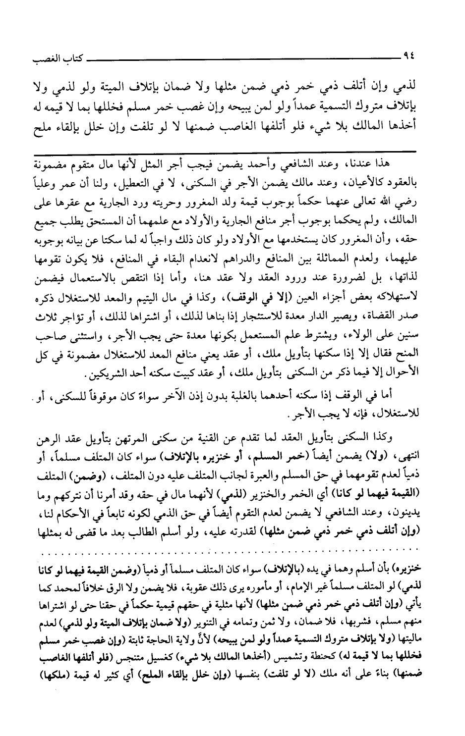 ولا يضمن أيضا خمر المسلم أو خنزيره بالإتلاف سواء كان المتلف مسلما أو ذميا لعدم تقومهما في حق المسلم والعبرة لجانب المتلف عليه دون المتلف وضمن المتلف القيمة فيهما لو كانا أي الخمر والخنزير لذمي لأنهما مال في حقه وقد أمرنا أن نتركهم وما يدينون وعند الشافعي لا يضمن لعدم التقوم أيضا في حق الذمي لكونه تابعا في الأحكام لنا