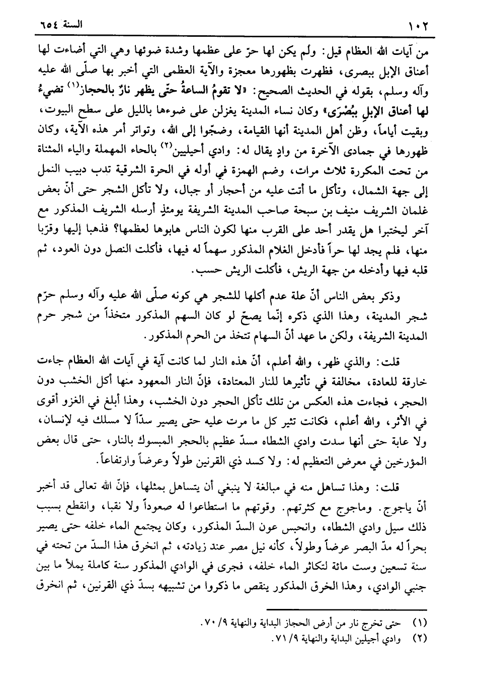 من آيات الله العظام قيل: ولم يكن لها حر على عظمها وشدة ضوئها وهي التي أضاءت لها أعناق الإبل ببصرى، فظهرت بظهورها معجزة والآية العظمى التي أخبر بها صلى الله عليه وآله وسلم، بقوله في الحديث الصحيح: " لا تقوم الساعة حتى يظهر نار بالحجاز تضيء لها أعناق الإبل ببصرى " وكان نساء المدينة يغزلن على ضوءها بالليل على سطح البيوت، وبقيت أيامًا، وظن أهل المدينة أنها القيامة، وضجوا إلى الله، وتواتر أمر هذه الآية، وكان ظهورها في جمادى الآخرة من واد يقال له: وادي أحيليين بالحاء المهملة والياء المثناة من تحت المكررة ثلاث مرات، وضم الهمزة في أوله في الحرة الشرقية تدب دبيب النمل إلى جهة الشمال، وتأكل ما أتت عليه من أحجار أو جبال، ولا تأكل الشجر حتى أن بعض غلمان الشريف منيف بن سبحة صاحب المدينة الشريفة يومئذ أرسله الشريف المذكور مع آخر ليختبرا هل يقدر أحد على القرب منها لكون الناس هابوها لعظمها؟ فذهبا إليها وقربا منها، فلم يجد لها حراً فأدخل الغلام المذكور سهماً له فيها، فأكلت النصل دون العود، ثم قلبه فيها وأدخله من جهة الريش، فأكلت الريش حسب.