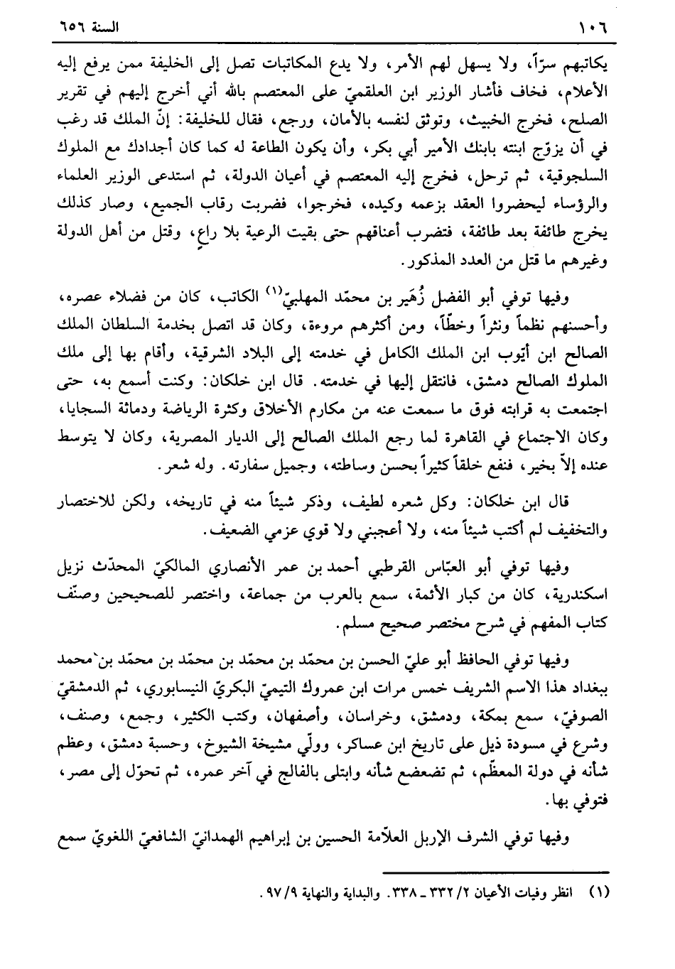 وفيها توفي أبو العباس القرطبي أحمد بن عمر الأنصاري المالكي المحدث نزيل اسكندرية، كان من كبار الأئمة، سمع بالعرب من جماعة، واختصر للصحيحين وصنف كتاب المفهم في شرح مختصرصحيح مسلم.