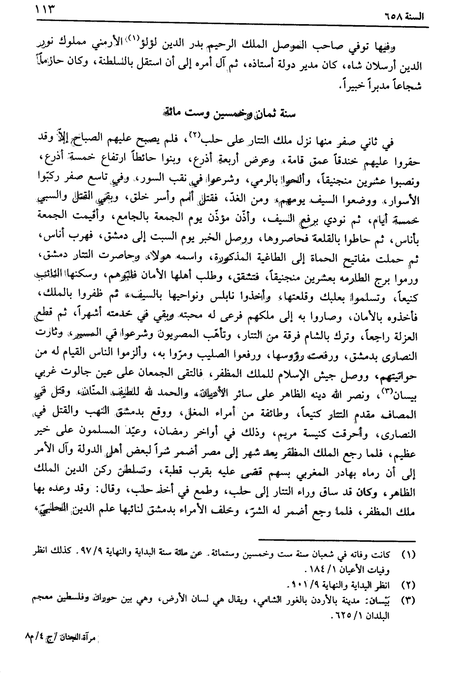 في ثاني صفرمنهانزل ملك التتارعلى حلب، فلم يصبح عليهم الصباح إلاوحفرواعليهم خندقاً عمق قامة، وعرض أربعة أذرع، وبنوا حائطًا ارتفاعه خمسة أذرع، ونصبواعشرين منجنيقاً، وألحوابالرمي، وشرعوافي نقب السور، وفي تاسع صفر ركبوا الأسوار، ووضعوا السيف يومهم، ومن الغد، فقتل أمم وأسرخلق، وبقي القتل والسسبي خمسة أيام، ثم نودي برفع السيف، وأذن مؤذن يوم الجمعةبالجامع، وأقيمت الجمعةبأناس، ثم حاطوا بالقلعة فحاصروها، ووصل الخبر يوم السبت إلى دمشق، فهرب أناس، ثم حملت مفاتيح الحماة إلى الطاغية المذكورة، واسمه هولا، وحاصرت التتار دمشق ورموا برج الطارمه بعشرين منجنيقًا، فتشقق، وطلب أهلها الأمان فلبوهم، وسكنهااليل كنيعًا، وتسلموابعلبك وقلعتها، وأخذوانابلس ونواحيهابالسيف، ثم ظفروا بالملك فأخذوه بالأمان، وصاروابه إلى ملكهم فرعى له محبته وبقي في خدمته أشهراً، ثم قطع العزلة راجعاً، وترك بالشام فرقة من التتار، وتأهب المصريون وشرعوا في المسير، ثارت النصارىبدمشق، ورفعت رؤوسها، ورفعوا الصليب ومروابه، وألزموا الناس القيام له حوانيتهم ووصل جيش الإسلام للملك المظفر، فالتقىالجمعان علىعين جالوت غربي بيسان، ونصرالله دينه الظاهر على سائرالأديان، والحمدلله للطيف المنان، وقتل المصاف مقدم التتار كنيعًا، وطائفة من أمراء المغل، ووقع بدمشق النهب والقتل النصارى، وأحرقت كنيسةمريم، وذلك في أواخر رمضان، وعيدالمسلمون علىعظيم، فلمارجع الملك المظفر بعد شهر إلى مصر أضمر شرًا لبعض أهل الدولة وآل الأمرإلى أن رماه بهادرالمغربي بسهم قضى عليه بقرب قطبة، وتسلطن ركن الدين الملك الظاهر، وكان قد ساق وراءالتتار إلى حلب، وطمع في أخذ حلب، وقال: وقدوعده بهاملك المظفرفلمارجع أضمرله الشر، وخلف الأمراءبدمشق لنائبهاعلم الدين الحلبي
