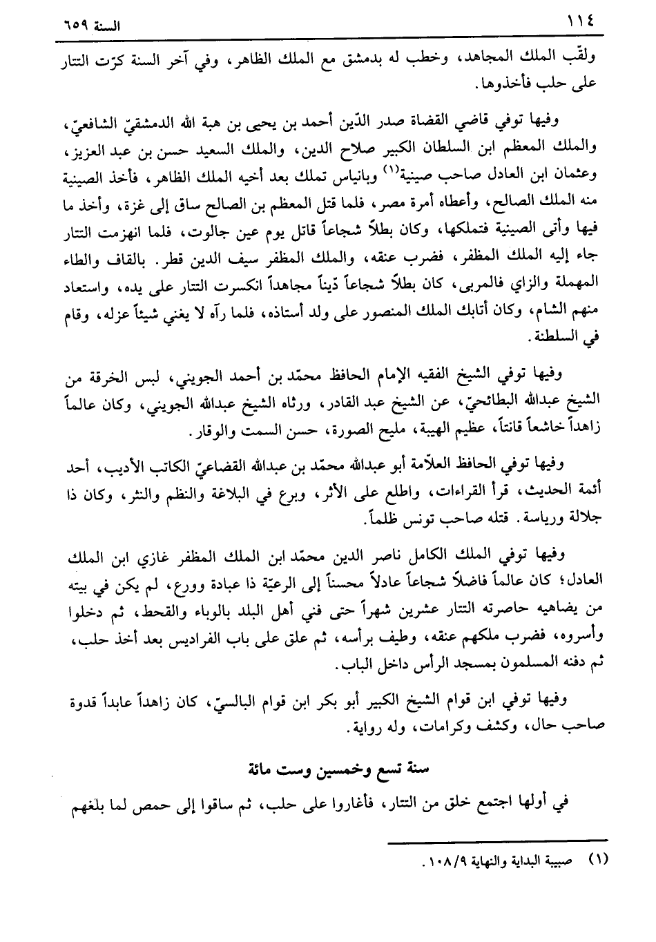 وفيها توفي قاضي القضاة صدرالدين أحمد بن يحيى بن هبة الله الدمشقي الثافعي، والملك المعظم ابن السلطان الكبير صلاح الدين، والملك السعيد حسن بن عبد العزيز، وعثمان ابن العادل صاحب صينيةوبانياس تملك بعد أخيه الملك الظاهر، فأخذ الصينية منه الملك الصالح، وأعطاه أمرة مصر، فلما قتل المعظم بن الصالح ساق إلى غزة، وأخذ ما فيها وأتى الصينية فتملكها، وكان بطلاً شجاعًا قاتل يوم عين جالوت، فلما انهزمت التتار جاء إليه الملك المظفر، فضرب عنقه، والملك المظفر سيف الدين قطر. بالقاف والطاء المهملة والزاي فالمربى، كان بطلاً شجاعًا دينًا مجا هدًا انكسرت التتارعلى يده، واستعاد منهم الشام، وكان أتابك الملك المنصور على ولد أستاذه، فلمارآه لا يغني شيئًاعزله، وقام في السلطنة.