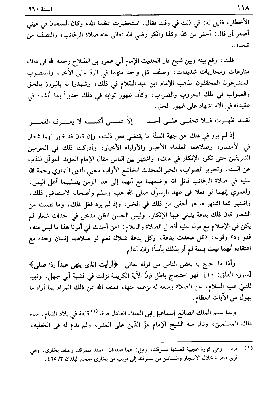 قلت: وقع بينه وبين شيخ دارالحديث الإمام أبي عمرو بن الصلاح رحمه الله في ذلك منازعات ومحاربات شديدات، وصنف كل واحد منهما في الرد على الآخر، واستصوب المتشرعون المحققون مذهب الإمام ابن عبد السلام في ذلك، وشهدوا له بالبروز بالحق الصواب في تلك الحروب والضراب، وكأن ظهور ثوابه في ذلك جديرًابماأنشده في عقيدته في الاستشهاد على ظهور الحق: