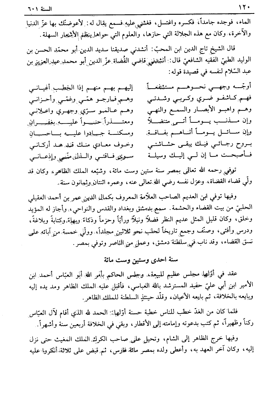وفيهاتوفي ابن العديم الصاحب العلامةالمعروف بكمال الدين عمربن أحمدالعقيلي الحلبي من بيت القضاء والحشمة. سمع بدمشق وبغدادوالقدس والنواحي، وأجاز له المؤيدوخلق، وكان قليل المثل عديم النظر فضلاً ونبلاً ورأيًا وحزمًا وذكاءً وبهاءً وكتابةً وبلاغةً، ودرس وأفتى، وصنف وجمع تاريخاًلحلب نحوثلاثين مجلدًا، وولي خمسةمن آبائه علىنسق القضاء، وقد ناب في سلطنة دمشق، وعمل من الناصروتوفي بمصر.