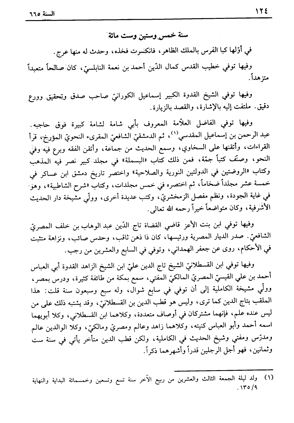 وفيها توفي الفاضل العلامة المعروف بأبي شامة لشامة كبيرة فوق حاجبه.