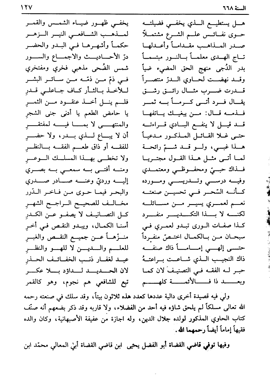 ولي فيه قصيدة أخرى دالية عددها كعدد هذه ثلاثون بيتاً، وقد سلك في صنعته رحمه الله تعالى مسلكاً لم يلحق شاؤه فيه أحد من الفضلاء، ولا قاربه وقد ذكر بضعهم أنه صنف كتاب الحاوي المذكور لولده جلال الدين، وله إجازة من عفيفة الأصبهانية، وكان والده فقيهاً إماماً أيضاً رحمهما الله.