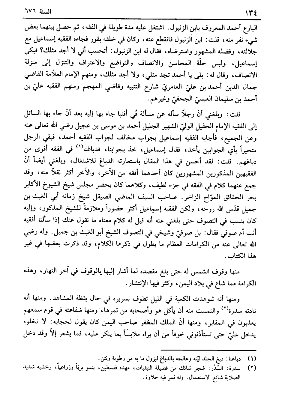 منها وقوف الشمس له حتى بلغ مقصده لما أشار إليها يالوقوف في آخر النهار، وهذه الكرامة مما شاع في بلاد اليمن، وكثر فيها الانتشار.