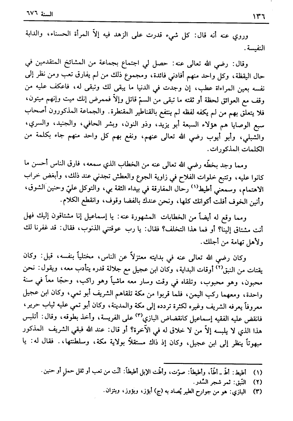 وقال: رضي الله تعالى عنه: حصل لي اجتماع بجماعة من المشائخ المتقدمين في حال اليقظة، وكل واحد منهم أفادني فائدة، ومجموع ذلك من لم يفارق تعب ومن نظر إلى نفسه بعين المراءاة عطب، إن وجدت في الحنيا ما يبقى لك وتبقى له، فاعكف عليه من وقف مع العوائق لحظة أو ثقته ما تبقى من السم قاتل وإلا فممرض إنك ميت وإنهم ميتون، فلا يتعلق بهم من لم يكفه لفظه لم ينتفع بالقناطير المقنطرة. والجماعة المذكورون أصحاب سبع الوصايا هم هؤلاء السبعة أبو يزيد، وذو النون، وبشر الحافي، والجنيد، والسري، والشبلي، وأبو أيوب رضي الله تعالى عنهم، ونفع بهم كل واحد منهم جاء بكلمة من الكلمات المذكورات.