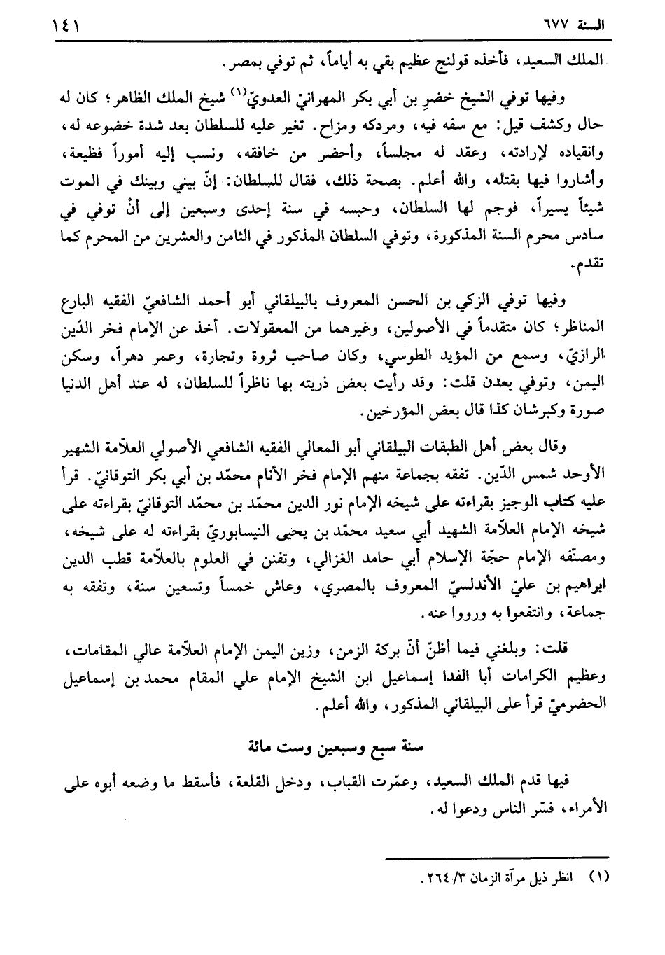 وفيها توفي الشيخ خضر بن أبي بكر المهراني العدوي شيخ الملك الظاهر؛ كان له حال وكشف قيل: مع سفه فيه، ومردكه ومزاح. تغير عليه للسلطان بعد شدة خضوعه له، وانقياده لإرادته، وعقد له مجلساً، وأحضر من خافقه، ونسب إليه أموراً فظيعة، وأشاروا فيها بقتله، والله أعلم. بصحة ذلك، فقال للسلطان: إن بيني وبينك في الموت شيئاً يسيراً، فوجم لها السلطان، وحبسه في سنة إحدى وسبعين إلى أن توفي في سادس محرم السنة المذكورة، وتوفي السلطان المذكور في الثامن والعشرين عن المحرم كما تقدم.