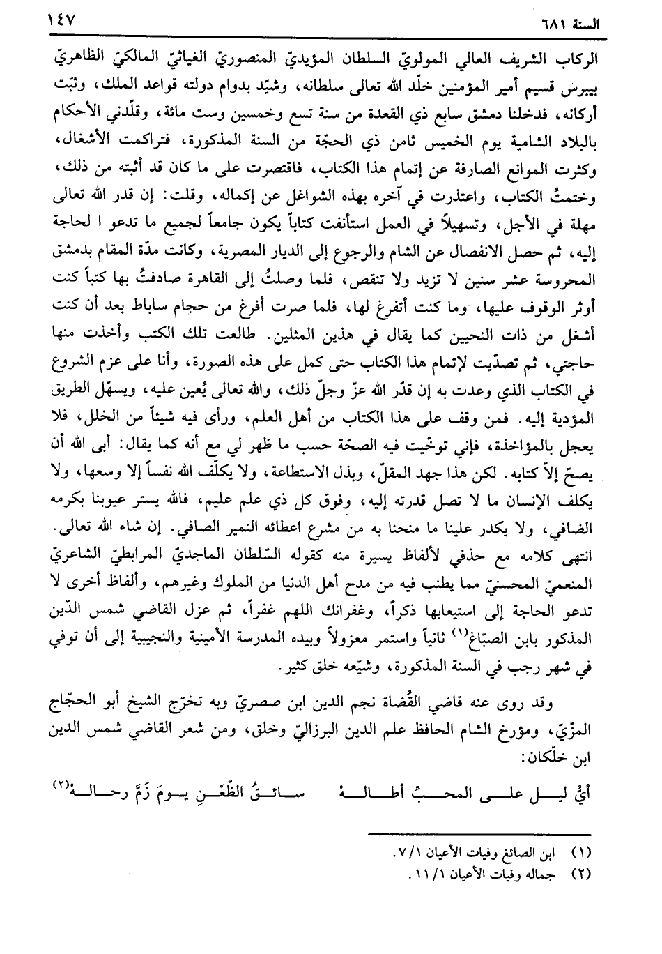 الركاب الشريف العالي المولوي السلطان المؤيدي المنصوري الغياثي المالكي الظاهري بيبرس قسيم أمير المؤمنين حمد الله تعالى سلطانه، وشيد بدوام دولته قواعد الملك، وثبت أركانه، فدخلنا دمشق سابع ذي القعدة من سنة تسع وخمسين وست مائة، وقلدني الأحكام بالبلاد الشامية يوم الخميس ثامن ذي الحجة من السنة المذكورة، فتراكمت الأشغال، وكثرت الموانع الصارفة عن إتمام هذا الكتاب، فاقتصرت على ما كان قد أثبته من ذلك، وختمت الكتاب، واعتذرت في آخره بهذه الشواغل عن إكماله، وقلت: إن قدر الله تعالى مهلة في الأجل، وتسهيلاً في العمل استأنفت كتاباً يكون جامعاً لجميع ما تدعو الحاجة إليه، ثم حصل الانفصال عن الشام والرجوع إلى الديار المصرية، وكانت مدة المقام بدمشق المحروسة عشر سنين لا تزيد ولا تنقص، فلما وصلت إلى القاهرة صادفت بها كتباً كنت أوثر الوقوف عليها، وما كنت أتفرغ لها، فلما صرت أفرغ من حجام ساباط بعد أن كنت أشغل من ذات النحيين كما يقال في هذين المثلين. طالعت تلك الكتب وأخذت منها حاجتي، ثم تصديت لإتمام هذا الكتاب حتى كمل على هذه الصورة، وأنا على عزم الشروع في الكتاب الذي وعدت به إن قدر الله عز وجل ذلك، والله تعالى يعين عليه، ويسهل الطريق المؤدية إليه. فمن وقف على هذا الكتاب من أهل العلم، ورأى فيه شيئاً من الخلل، فلا يعجل بالمؤاخذة، فإني توخيت فيه الصحة حسب ما ظهر لي مع أنه كما يقال: أبى الله أن يصح إلا كتابه. لكن هذا جهد المقل، وبذل الاستطاعة، ولا يكلف الله نفساً إلا وسعها، ولا يكلف الإنسان ما لا تصل قدرته إليه، وفوق كل في علم عليم، فالله يستر عيوبنا بكرمه الضافي، ولا يكدر علينا ما منحنا به من مشرع إعطائه النمير الصافي. إن شاء الله تعالى. انتهى كلامه مع حذفي لألفاظ يسيرة منه كقوله السلطان الماجدي المرابطي الشاعري المنعمي المحسني مما يطنب فيه من مدح أهل الدنيا من الملوك وغيرهم، وألفاظ أخرى لا تدعو الحاجة إلى استيعابها ذكراً، وغفرانك اللهم غفراً، ثم عزل القاضي شمس الدين المذكور بابن الصباغ ثانياً واستمر معزولاً وبيده المدرسة الأمينية والنجيبية إلى أن توفي في شهر رجب في السنة المذكورة، وشيعه خلق كثير.
