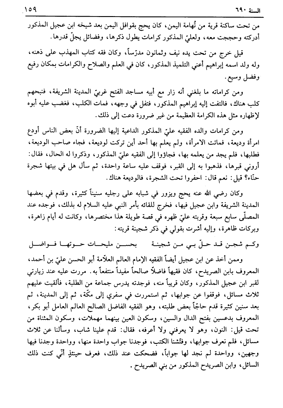 وممن أخذ عن ابن عجيل أيضاً الفقيه الإمام العالم العلامة أبو الحسن علي بن أحمد، المعروف بابن الصريدح، كان فقيهاً فاضلاً صالحاً مفيداً منتفعاً به. مررت عليه عند زيارتي لقبر ابن عجيل المذكور، وكان قويباً منه، فوجدته يدرس جماعة من الطلبة، فألقيت عليهم ثلاث مسائل، فوقفوا عن جوابها، ثم استمررت في سفري إلى مكة، ثم إلى المدينة، ثم بعد سنين كثيرة قدم حاجاً بعض طلبته، وهو الفقيه الفاضل الصالح العالم العامل أبو بكر، المعروف بدعسين بفتح الدال والسين، وسكون العين بينهما مهملات، وسكون المثناة من تحت قيل: النون، وهو لا يعرفني ولا أعرفه، فقال: قدم علينا شاب، وسألنا عن ثلاث مسائل، فلم نعرف جوابها، وفتشنا الكتب، فوجدنا جواب واحدة منها، وواحدة وجدنا فيها وجهين، وواحدة لم نجد لها جواباً، فضحكت عند ذلك، فعرف حيئذٍ أني كنت ذلك السائل، وابن الصريدح المذكور من بني الصريدح.