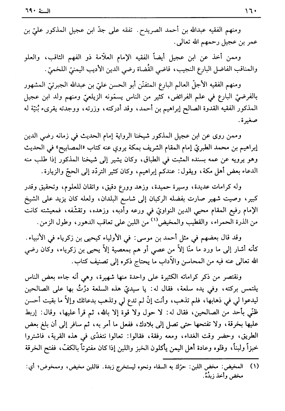 ومنهم الفقيه الأجل العالم البارع المتفنن أبو الحسن علي بن عبد الله الجبرتي المشهور بالفرضي البارع في علم الفرائض، كثير من الناس يسمونه الزيلعي ومنهم ولد ابن عجيل المذكور الفقيه القدوة الصالح إبراهيم بن أحمد، وقد أدركته، وزرته، ووجدته يقرئ بنية له صغيرة.