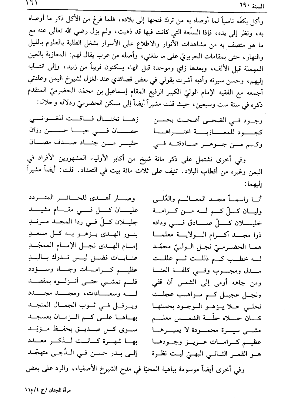 وفي أخرى تشتمل على ذكر مائة شيخ من أكابر الأولياء المشهورين الأفراد في اليمن وغيره من أقطاب البلاد. تنيف على ثلاث مائة بيت في التعداد. قلت: أيضاً مشيراً إليهما: