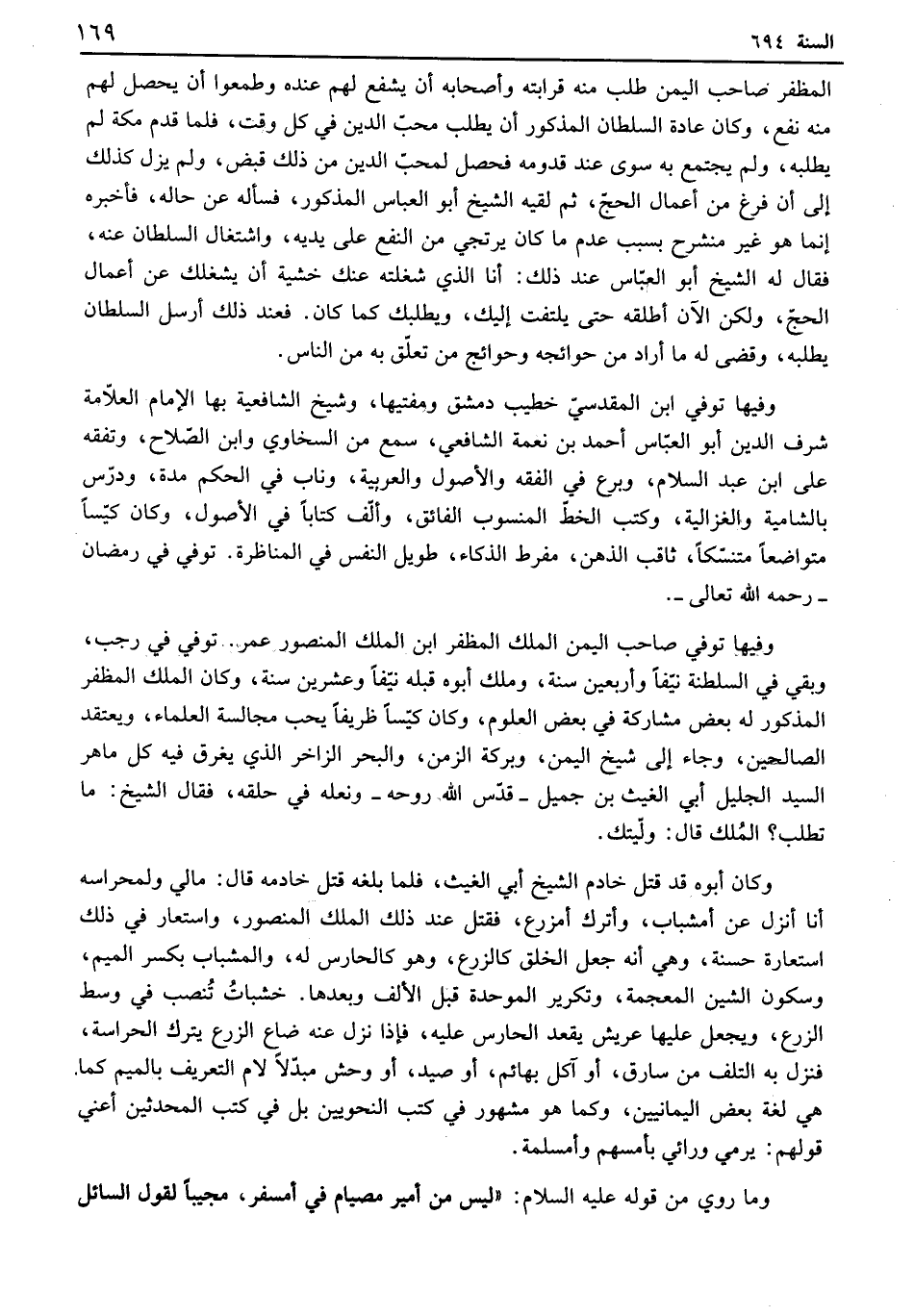 وكان أبوه قد قتل خادم الشيخ أبي الغيث، فلما بلغه قتل خادمه قال: مالي ولمحراسه أنا أنزل عن أمشباب، وأترك أمزرع، فقتل عند ذلك الملك المنصور، واستعار في ذلك استعارة حسنة، وهي أنه جعل الخلق كالزرع، وهو كالحارس له، والمشباب بكسر الميم، وسكون الشين المعجمة، وتكرير الموحدة قبل الألف وبعدها. خشبات تنصب في وسط الزرع، ويجعل عليها عريش يقعد الحارس عليه، فإذا نزل عنه ضاع الزرع يترك الحراسة، فنزل به التلف من سارق، أو آكل بهائم، أو صيد، أو وحش مبذلاً لام التعريف بالميم كما هي لغة بعض اليمانيين، وكما هو مشهور في كتب النحويين بل في كتب المحدثين أعني قولهم: يرمي ورائي بأمسهم وأمسلمة.
