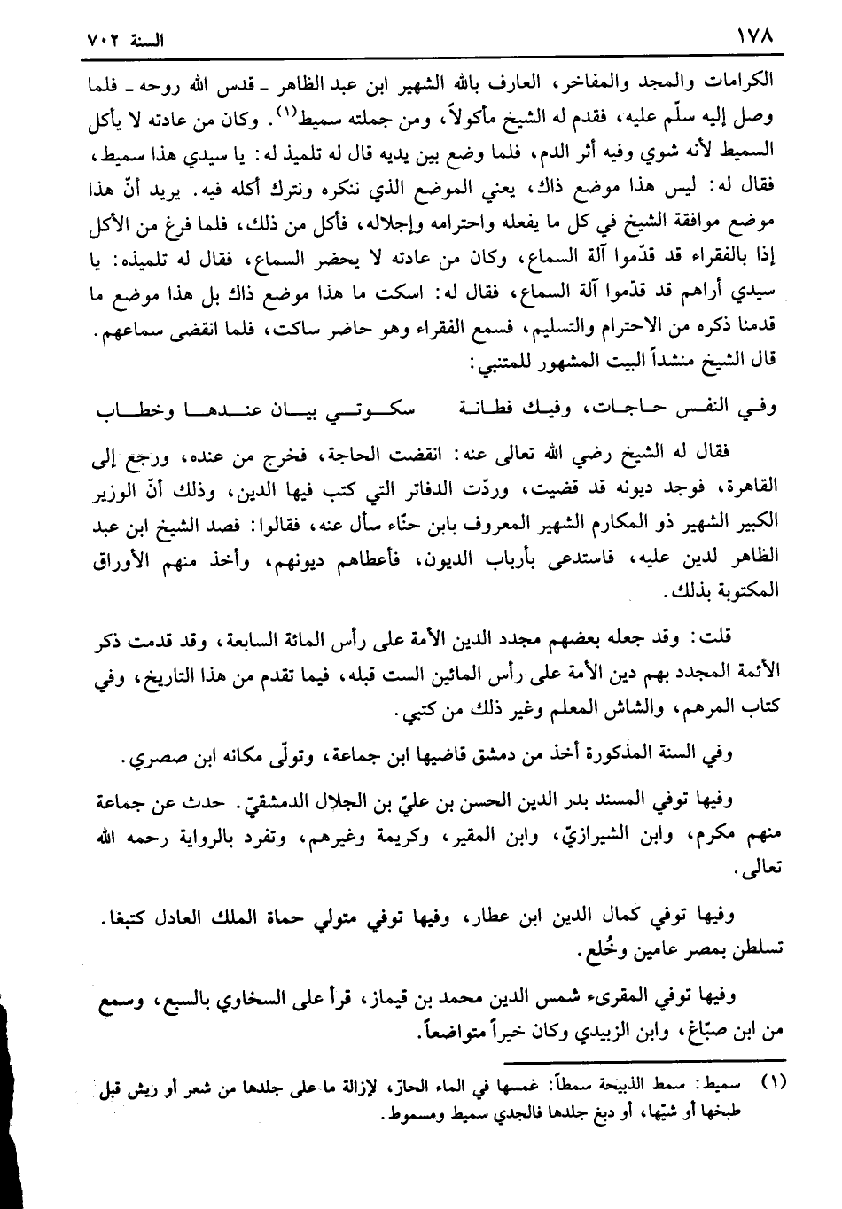 الكرامات والمجد والمفاخر، العارف بالله الشهير ابن عبد الظاهر - قدس الله روحه - فلما وصل إليه سلم عليه، فقدم له الشيخ مأكولاً، ومن جملته سميط. وكان من عادته لا يأكل السميط لأنه شوي وفيه أثر الدم، فلما وضع بين يديه قال له تلميذ له: يا سيدي هذا سميط، فقال له: ليس هذا موضع ذاك، يعني الموضع الذي ننكره ونترك أكله فيه. يريد أن هذا موضع موافقة الشيخ في كل ما يفعله واحترامه وإجلاله، فأكل من ذلك، فلما فرغ من الأكل إذا بالفقراء قد قدموا آلة السماع، وكان من عادته لا يحضر السماع، فقال له تلميذه: يا سيدي أراهم قد قدموا آلة السماع، فقال له: اسكت ما هذا موضع ذاك بل هذا موضع ما قدمنا ذكره من الاحترام والتسليم، فسمعالفقراء وهو حاضر ساكت، فلما انقضى سماعهم. قال الشيخ منشداً البيت المشهور للمتنبي:
