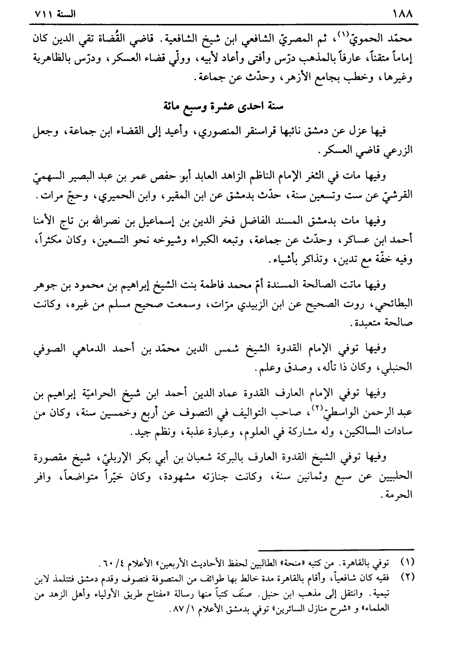 وفيها توفي الإمام العارف القدوة عماد الدين أحمد ابن شيخ الحرامية إبراهيم بن عبد الرحمن الواسطي، صاحب التواليف في التصوف عن أربع وخمسين سنة، وكان من سادات السالكين، وله مشاركة في العلوم، وعبارة عذبة، ونظم جيد.