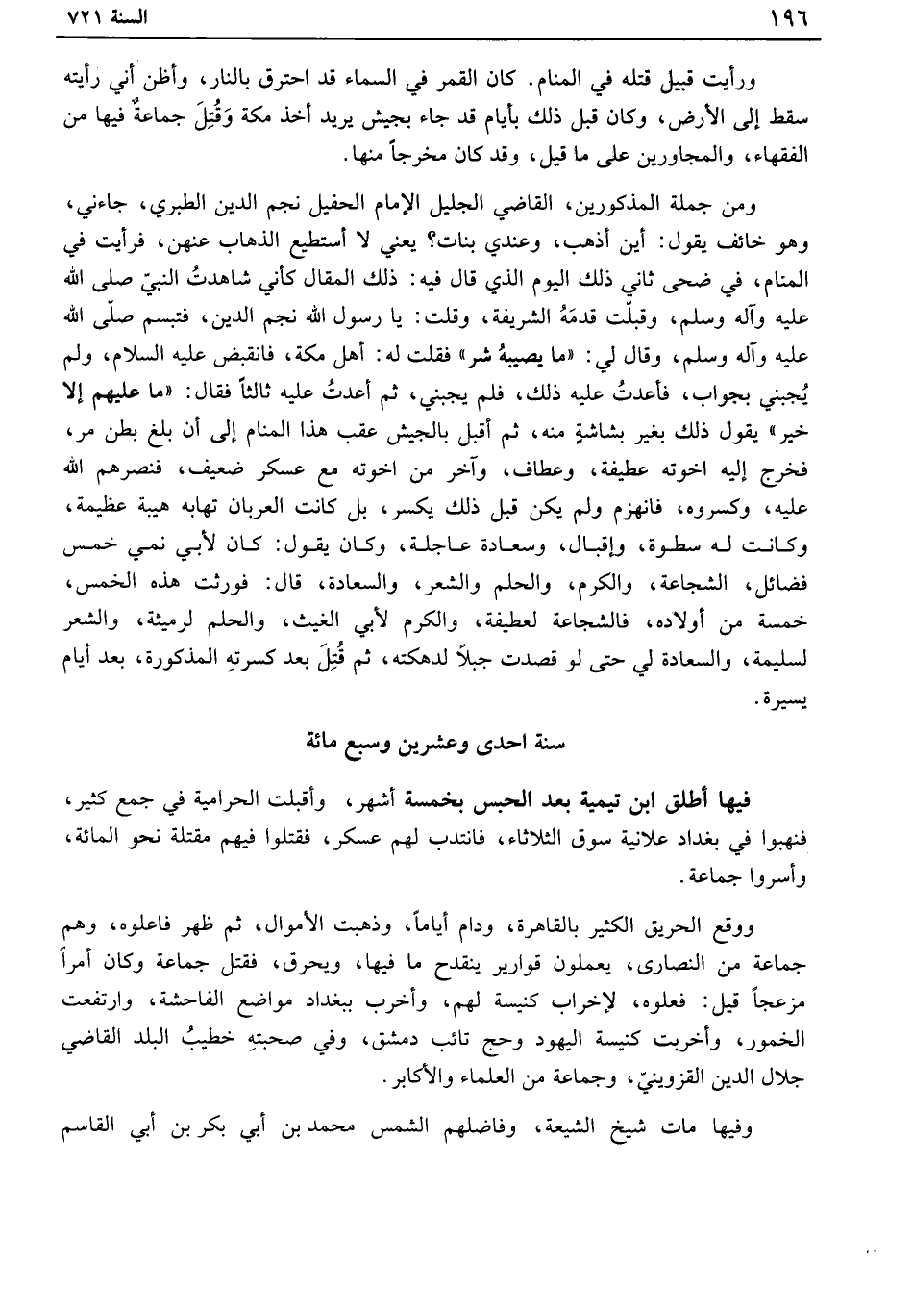 فيها أطلق ابن تيمية بعد الحبس بخمسة أشهر، وأقبلت الحرامية في جمع كثير، فنهبوا في بغداد علانية سوق الثلاثاء، فانتدب لهم عسكر، فقتلوا فيهم مقتلة نحو المائة، وأسروا جماعة.