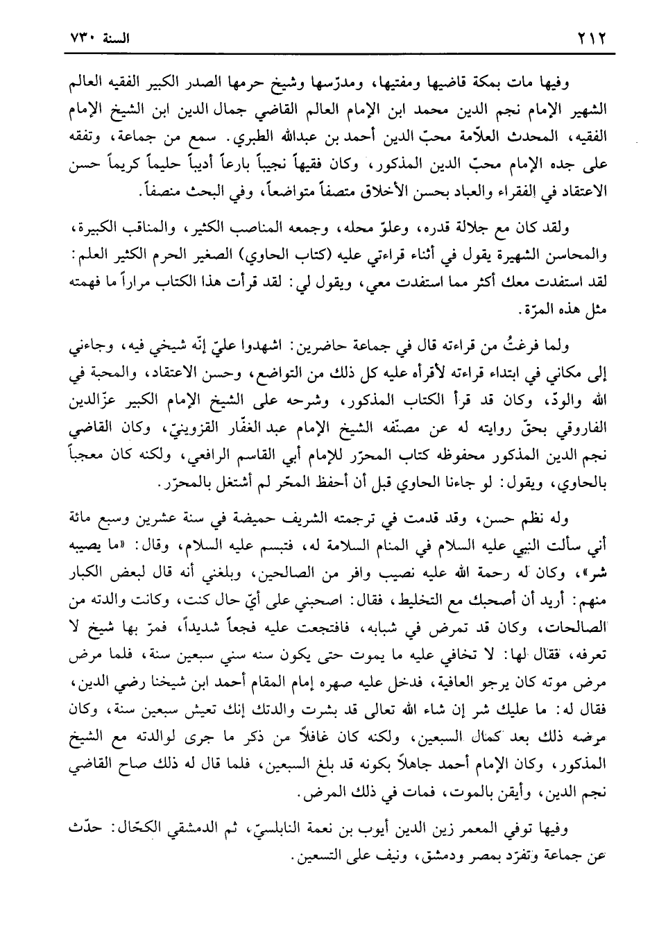 وفيها مات بمكة قاضيها ومفتيها، ومدرسها وشيخ حرمها الصدر الكبير الفقيه العالم الشهير الإمام نجم الدين محمد ابن الإمام العالم القاضي جمال الدين ابن الشيخ الإمام الفقيه، المحدث العلامة محب الدين أحمد بن عبد الله الطبري. سمع من جماعة، وتفقه على جده الإمام محب الدين المذكور، وكان فقيهاً نجيباً بارعاً أديباً حليماً كريماً حسن الاعتقاد في الفقراء والعباد بحسن الأخلاق متصفاً متواضعاً، وفي البحث منصفاً.