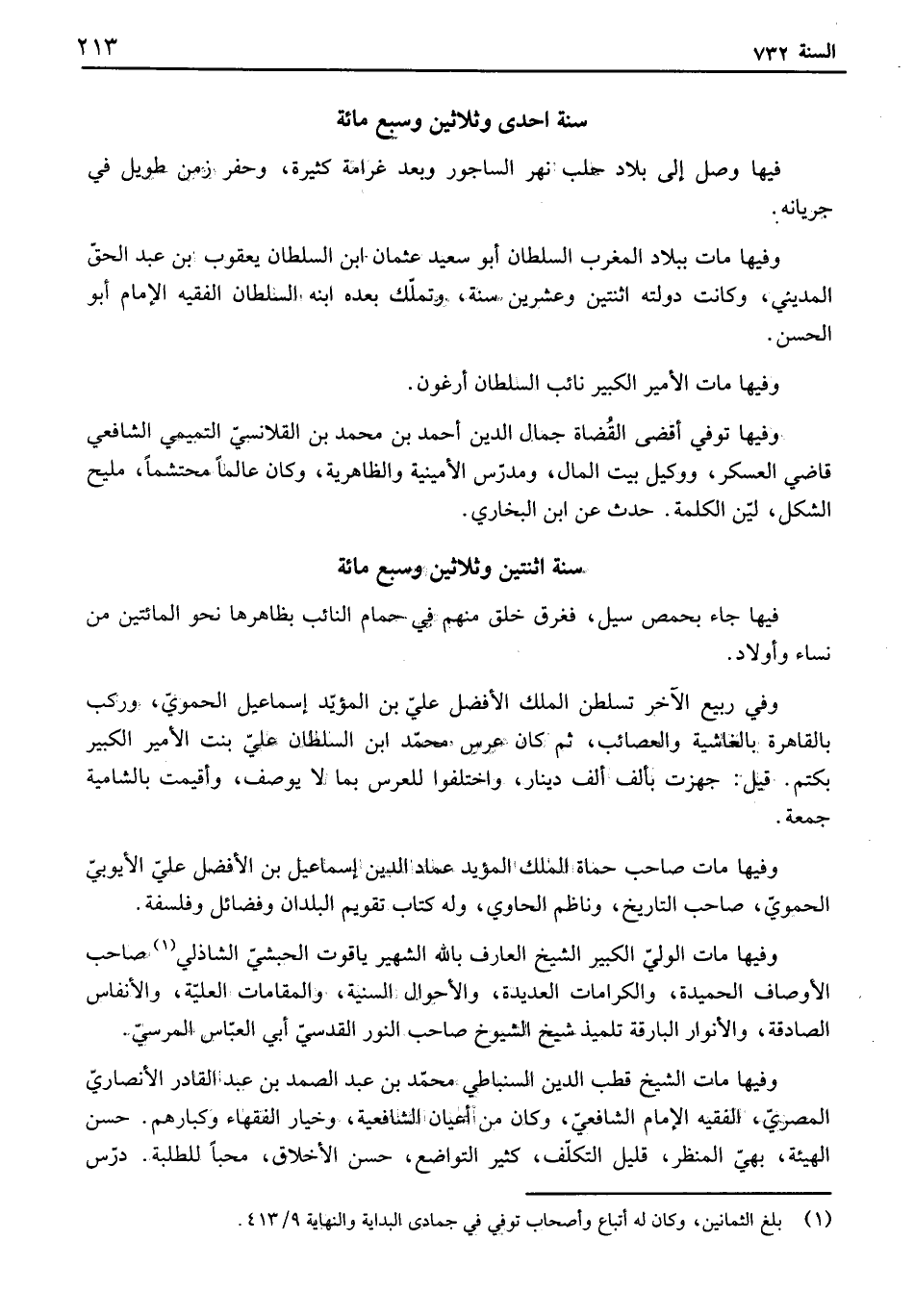 وفيها مات صاحب حماة الملك المؤيد عماد الدين إسماعيل بن الأفضل علي الأيوبي الحموي، صاحب التاريخ، وناظم الحاوي، وله كتاب تقويم البلدان وفضائل وفلسفة.