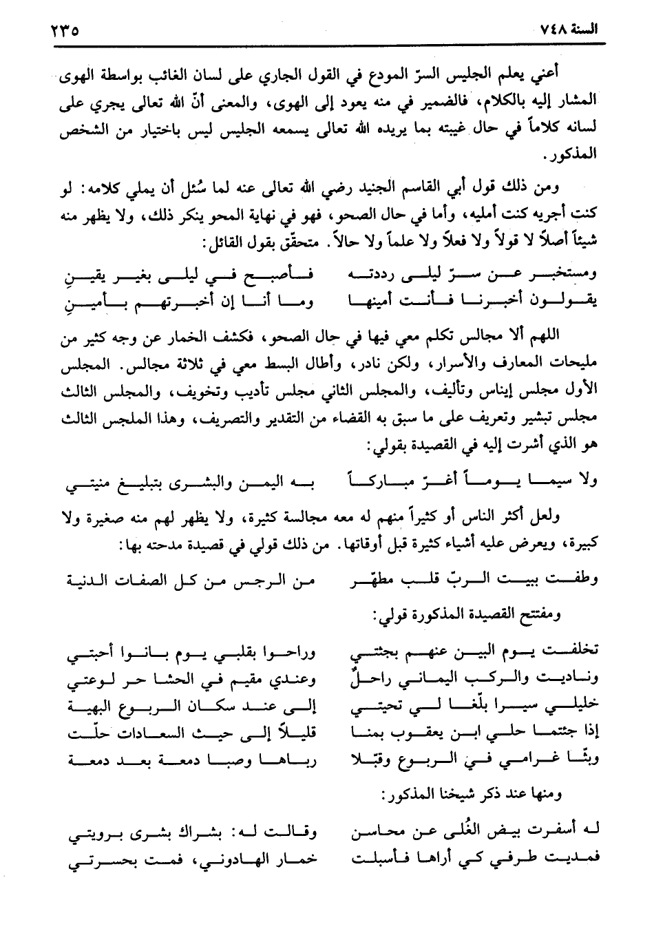 اللهم ألا مجالس تكلم معي فيها في حال الصحو، فكشف الخمار عن وجه كثير من مليحات المعارف والأسرار، ولكن نادر، وأطال البسط معي في ثلاثة مجالس. المجلس الأول مجلس إيناس وتأليف، والمجلس الثاني مجلس تأديب وتخويف، والمجلس الثالث مجلس تبشير وتعريف على ما سبق به القضاء من التقدير والتصريف، وهذا المجلس الثالث هو الذي أشرت إليه في القصيدة بقولي: