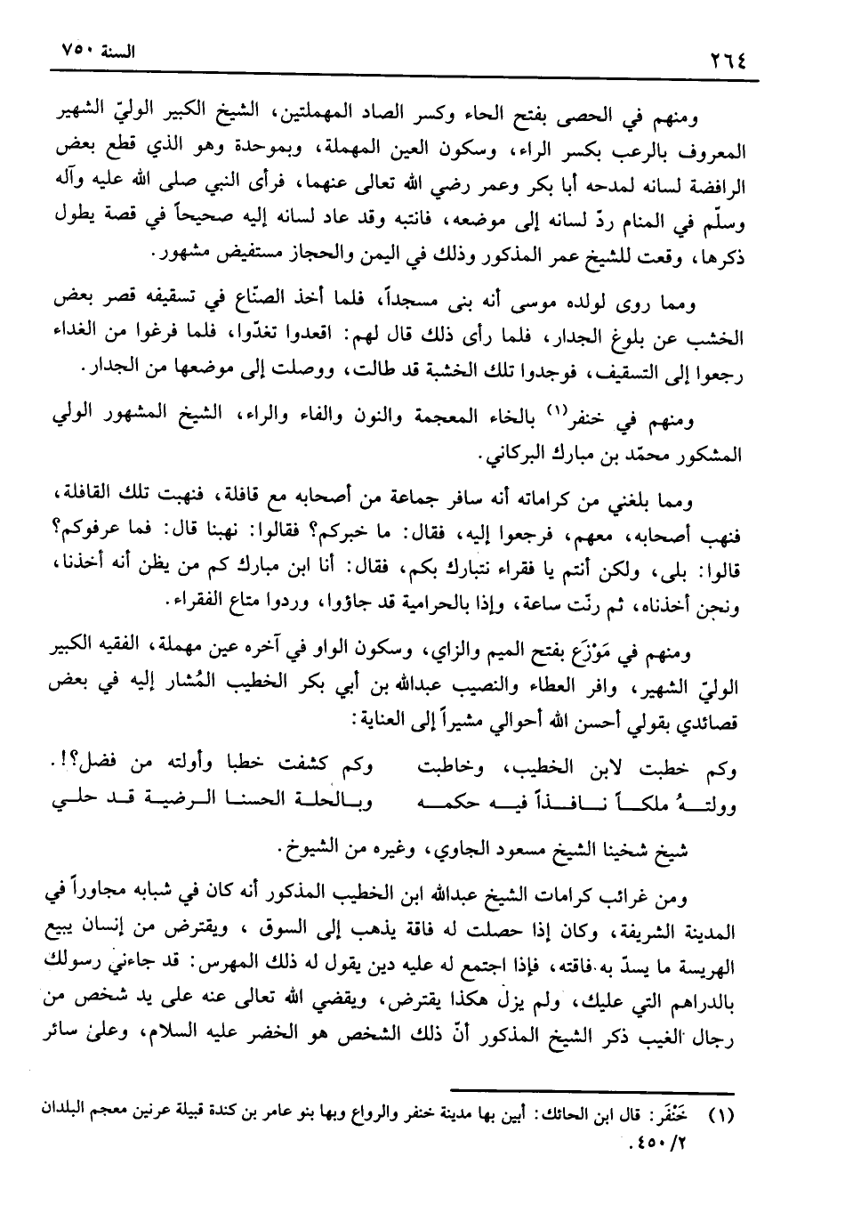 ومما روى لولده موسى أنه بنى مسجداً، فلما أخذ الصناع في تسقيفه قصر بعض الخشب عن بلوغ الجدار، فلما رأى ذلك قال لهم: اقعدوا تغدوا، فلما فرغوا من الغداء رجعوا إلى التسقيف، فوجدوا تلك الخشبة قد طالت، ووصلت إلى موضعها من الجدار. ومنهم في خنفر بالخاء المعجمة والنون والفاء والراء، الشيخ المشهور الولي المشكور محمد بن مبارك البركاني.