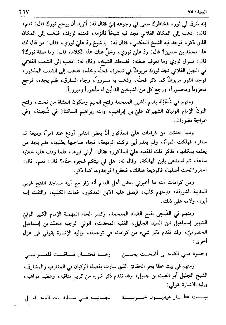 إنه سرق لي ثور، فخاطرك سعى في رجوعه إلي فقال له: أتريد أن يرجع ثورك قال: نعم قال: اذهب إلى المكان الفلاني نجد فيه شيخاً فألزمه، فعنده ثورك، فذهب إلى المكان الذي ذكر، فوجد فيه الشيخ الحكمي، فقال له: يا شيخ رد علي ثوري، فقال: من قال لك هذا محمد بن حسين؟ قال: رد علي ثوري، وخل عنك هفا الكلام، قال: وما صفة ثورك؟ قال: تسرق ثوري وما تعرف صفته: فضحك الشيخ، وقال له: اذهب إلى الشعب الفلاني في الجبل الفلاني تجد ثورك مربوطاً في شجرة، فحله وخذه، فذهب إلى الشعب المذكور، فوجد الثور مربوطاً كما ذكر فحله، وذهب به مسروراً، وجاء السارق، فلم يجده، فرجع محزوناً ومحسوراً، ورجع كل من الشيخين الدالين له مأجوراً ومبروراً.