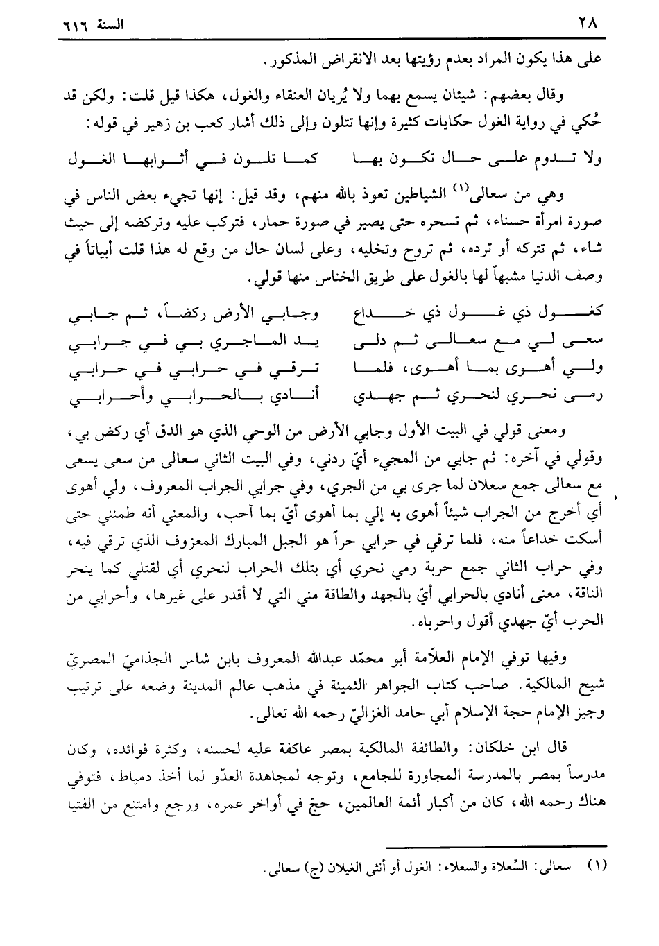 وهي من سعالى الشياطين تعوذ بالله منهم، وقد قيل: إنها تجيء بعض الناس في صورة امرأة حسناء، ثم تسحره حتى يصير في صورة حمار، فتركب عليه وتركضه إلى حيث شاء، ثم تتركه أو ترده، ثم تروح وتخليه، وعلى لسان حال من وقع له هذا قلت أبياتًا في وصف الدنيا مشبهًا لها بالغول على طريق الخناس منها قولي.