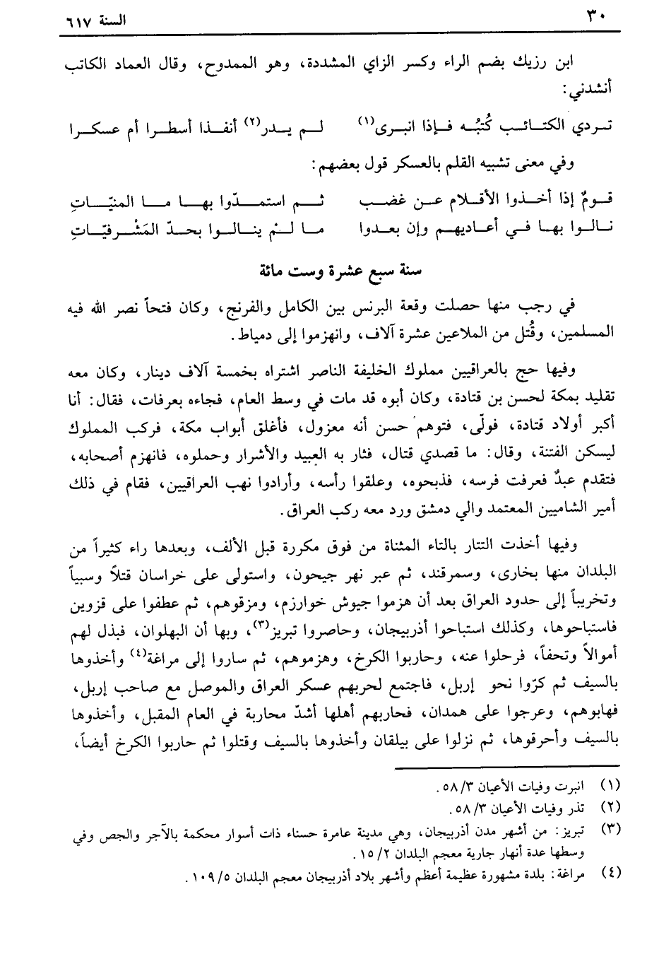 وفيها أخذت التتار بالتاء المثناة من فوق مكررة قبل الألف، وبعدها راء كثيرًا من البلدان منها بخارى، وسمرقند، ثم عبر نهر جيحون، واستولى على خراسان قتلاً وسبيًا وتخريباً إلى حدود العراق بعد أن هزموا جيوش خوارزم، ومزقوهم، ثم عطفوا على قزوين فاستباحوها، وكذلك استباحوا أذربيجان، وحاصروا تبريز، وبها أن البهلوان، فبذل لهم أموالاً وتحفًا، فرحلوا عنه، وحاربوا الكرخ، وهزموهم، ثم ساروا إلى مراغة وأخذوها بالسيف ثم كروا نحو إربل، فاجتمع لحربهم عسكر العراق والموصل مع صاحب إربل، فهابوهم، وعرجوا على همدان، فحاربهم أهلها أشد محاربة في العام المقبل، وأخذوها بالسيف وأحرقوها، ثم نزلوا على بيلقان وأخذوها بالسيف وقتلوا ثم حاربوا الكرخ أيضًا،