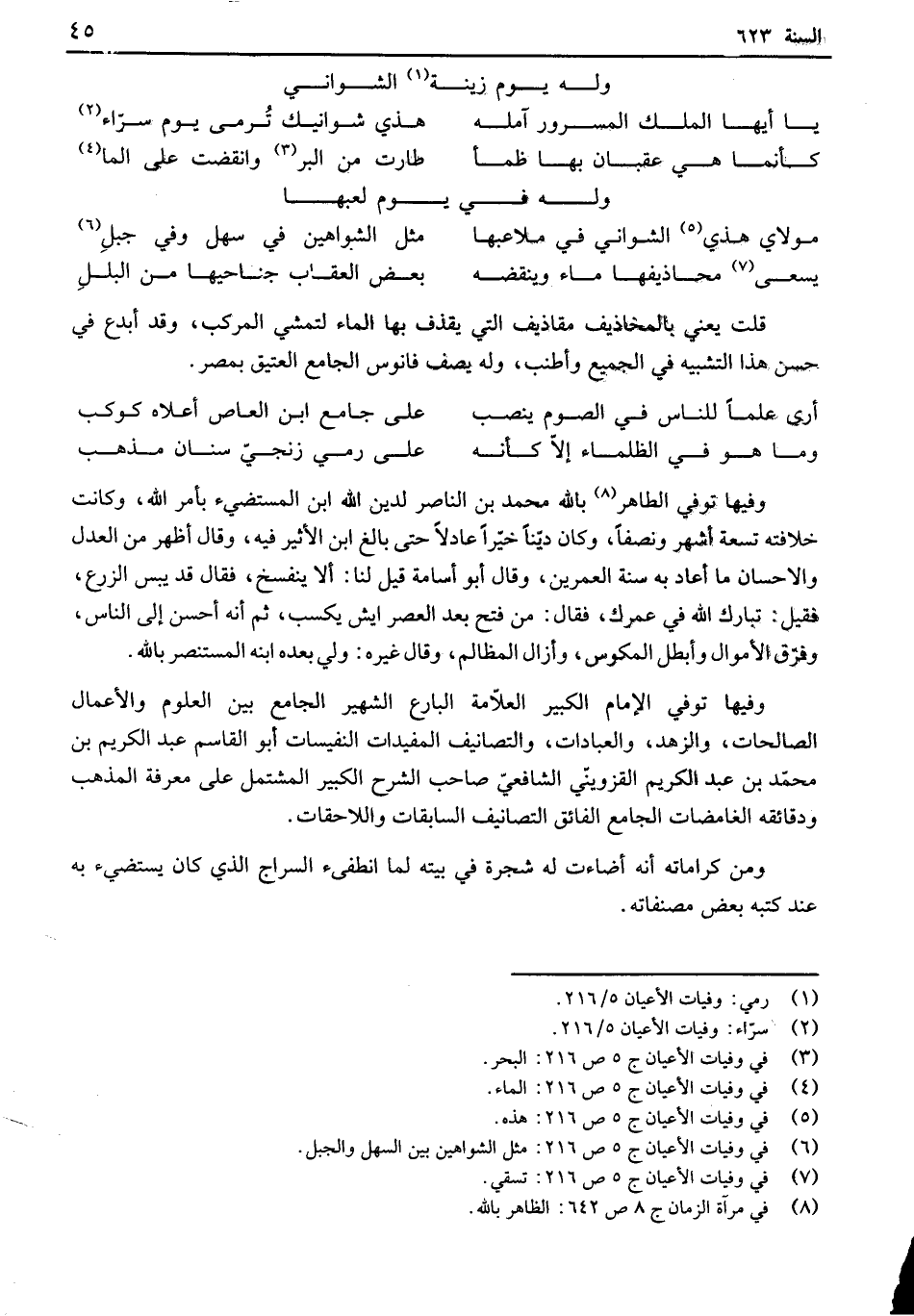 قلت يعني بالمخاذيف مقاذيف التي يقذف بها الماء لتمشي المركب، وقد أبدع في حسن هذا التشبيه في الجميع وأطنب، وله يصف فانوس الجامع العتيق بمصر.