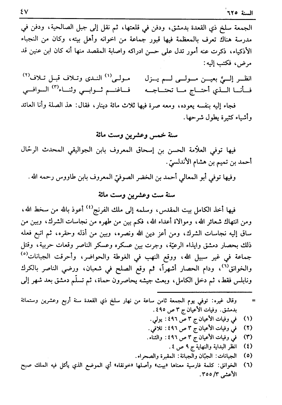 فيها أخذ الكامل بيت المقدس، وسلمه إلى ملك الفرنج أعوذ بالله من سخط الله، ومن انتهاك شعائر الله، وموالاة أعداء الله، فكم بين من طهره من نجاسات الشرك، وبين من ساق إليه نجاسات الشرك، ومن أعز دين الله ونصره، وبين من أذله وحقره، ثم اتبع فعله ذلك بحصار دمشق وايذاء الرعية، وجرت بين عسكره وعسكر الناصر وقعات حربية، وقتل جماعة في غير سبيل الله، ووقع النهب في الغوطة والحواضر، وأحرقت الجبانات والخوانق ودام الحصار أشهرًا، لم وقع الصلح في شعبان، ورضي الناصر بالكرك ونابلس فقط، ثم دخل الكامل، وبعث جيشه يحاصرون حماة، ثم تسلم دمشق بعد شهر إلى