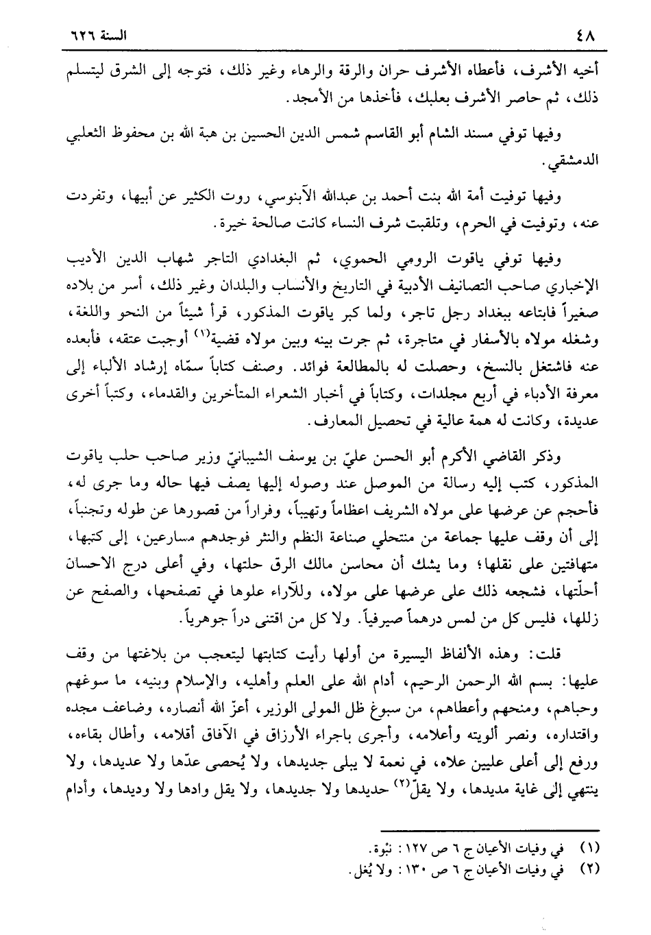وفيها توفي ياقوت الرومي الحموي، ثم البغدادي التاجر شهاب الدين الأديب الإخباري صاحب التصانيف الأدبية في التاريخ والأنساب والبلدان وغير ذلك، أسر من بلاده صغيرًا فابتاعه ببغداد رجل تاجر، ولما كبر ياقوت المذكور، قرأ شيئًا من النحو واللغة، وشغله مولاه بالأسفار في متاجرة، ثم جرت بينه وبين مولاه قضية أوجبت عتقه، فأبعده عنه فاشتغل بالنسخ، وحصلت له بالمطالعة فوائد. وصنف كتابًا سماه إرشاد الألباء إلى معرفة الأدباء في أربع مجلدات، وكتابًا في أخبار الشعراء المتأخرين والقدماء، وكتبًا أخرى عديدة، وكانت له همة عالية في تحصيل المعارف.