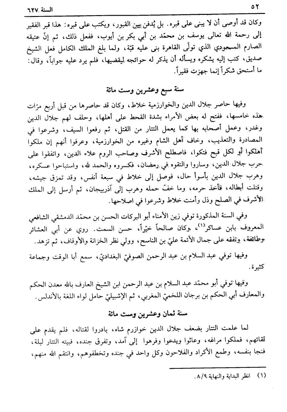 فيها حاصر جلال الدين والخوارزمية خلاط، وكان قد حاصرها من قبل أربع مرات هذه خامسها، ففتح له بعض الأمراء بشدة القحط على أهلها، وحلف لهم جلال الدين وغدر، وعمل أصحابه بها كما يعمل التتار من القتل، ثم رفعوا السيف، وشرعوا في المصادرة والتعذيب، وخاف أهل الشام وغيره من الخوارزمية، وعرفوا أنهم إن ملكوا أهلكوا أو لكل قبح فتكوا، فاصطلح الأشرف وصاحب الروم علاء الدين، واتفقوا على حرب جلال الدين، وساروا والتقوه في رمضان، فكسروه والحمد لله، واستباحوا عسكره، وهرب جلال الدين بأسوأ حال، فوصل إلى خلاط في سبعة أنفس، وقد تمزق جيشه، وقتلت أبطاله، فأخذ حرمه، وما خف حمله وهرب إلى أذربيجان، ثم أرسل إلى الملك الأشرف في الصلح وذل وأمنت خلاط وشرعوا في إصلاحها.