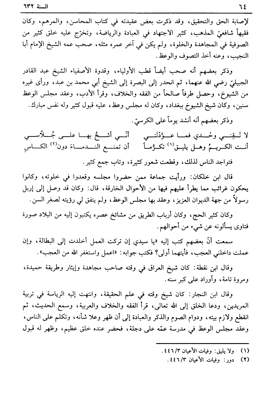 وذكر بعضهم أنه صحب أيضاً قطب الأولياء، وقدوة الأصفياء الشيخ عبد القادر الجبيلي رضي الله عنهما، ثم انحدر إلى البصرة إلى الشيخ أبي محمد بن عبد، ورأى غيره من الشيوخ، وحصل طرفًا صالحًا الفقه والخلاف، وقرأ الأدب، وعقد مجلس الوعظ سنين، وكان شيخ الشيوخ ببغداد، وكان له مجلس وعظ، عليه قبول كثير وله نفس مبارك. وذكر بعضهم أنه أنشد يومًا على الكرسي.
