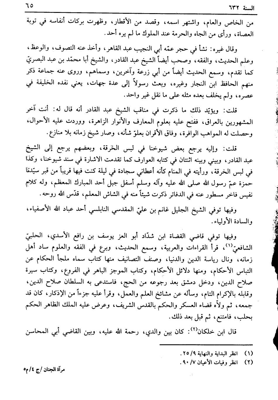 قلت: ويؤيد ذلك ما ذكرت في مناقب الشيخ عبد القادر أنه قال له: أنت آخر المشهورين بالعراق، ففتح عليه بعلوم المعارف والأنوار الزاهرة، ووردت عليه الأحوال وحصلت له المواهب الوافرة، وفاق الأقران بعلو شأنه، وصار شيخ زمانه بلا منازع. قلت: وإليه يرجع بعض شيوخنا في لبس الخرقة، وبعضهم يرجع إلى الشيخ عبد القادر، وبيني وبينه اثنتان في كتابه العوارف كما تقدمت الاشارة في سند شيوخنا، وكذا في لبس الخرقة، ورأيته في المنام كأنه أعطاني سجادة في ليلة كنت فيها قريبًا من قبر سيدنا عم رسول الله صلى الله عليه واله وسلم أسفل جبل أحد المبارك المعظم، وله كلام نفيس فاخر مسطور عنه في الدفاتر ذكرت شيئًا منه في الشاش المعلم، قدس الله روحه. وفيها توفي الشيخ الجليل غانم بن علي المقدسي النابلسي أحد عباد الله الأصفياء والسادة الأولياء.