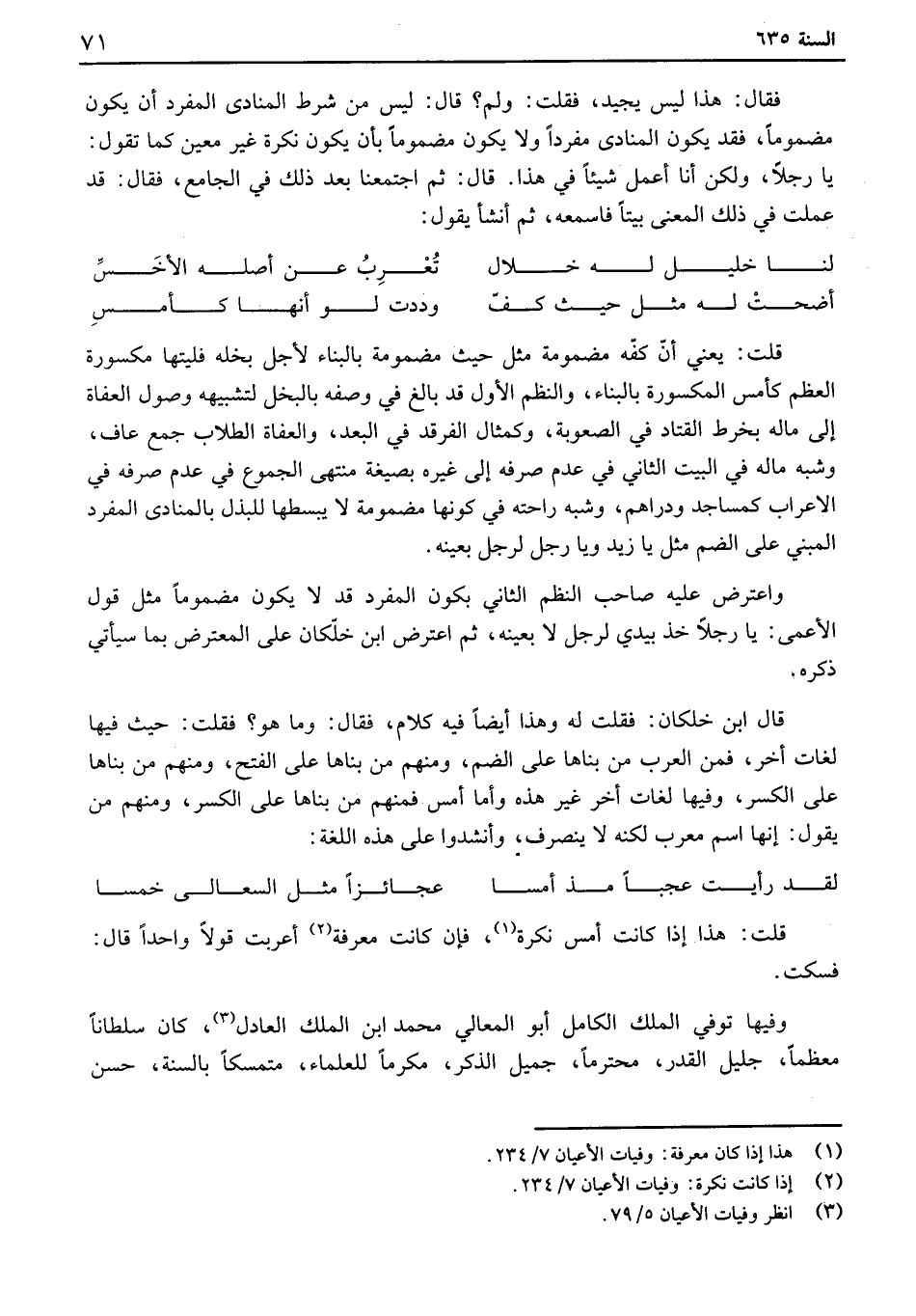 قلت: هذا إذا كانت أمس نكرة، فإن كانت معرفة أعربت قولاً واحدًا قال فسكت. وفيها توفي الملك الكامل أبو المعالي محمد ابن الملك العادل، كان سلطاناًمعظمًا، جليل القدر، محترماً، جميل الذكر، مكرمًا للعلماء، متمسكاًبالسنة، حسن