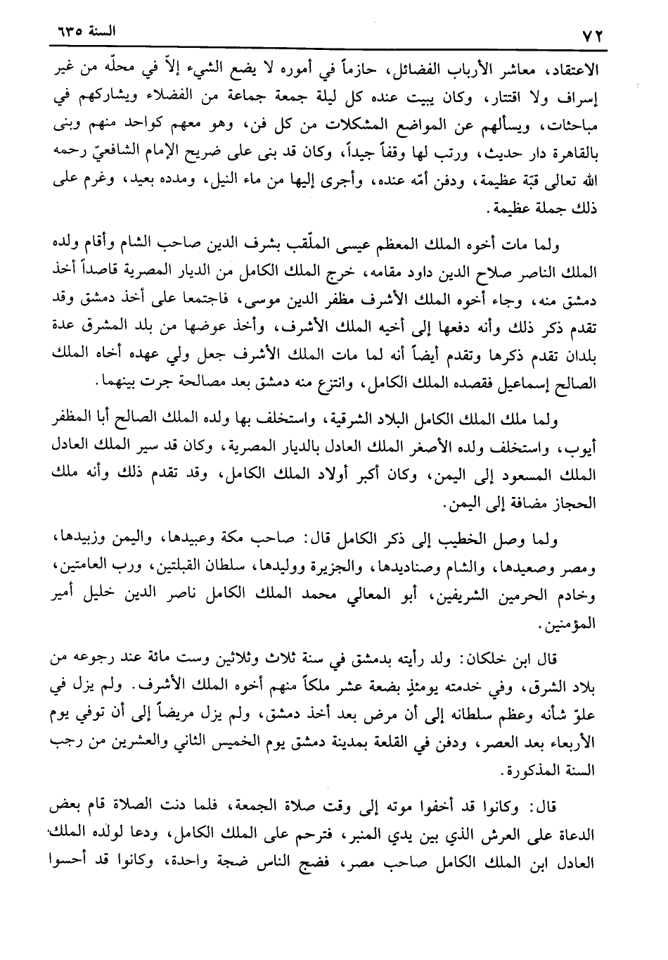 قال: وكانوا قد أخفوا موته إلى وقت صلاة الجمعة، فلما دنت الصلاة قام بعض الدعاة على العرش الذي بين يدي المنبر، فترحم علىالملك الكامل، ودعا لولده الملك العادل ابن الملك الكامل صاحب مصر، فضج الناس ضجة واحدة، وكانوا قد أحسوا