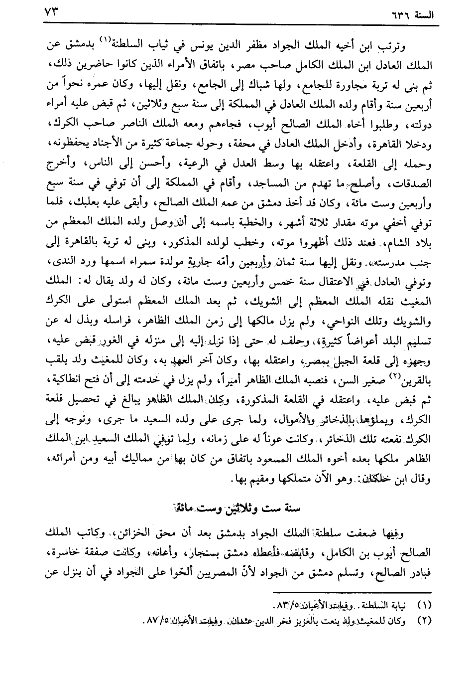وترتب ابن أخيه الملك الجواد مظفر الدين يونس في ثياب السلطنة بدمشق عن الملك العادل ابن الملك الكامل صاحب مصر، باتفاق الأمراء الذين كانوا حاضرين ذلك، ثم بنى له تربة مجاورة للجامع، ولها شباك إلى الجامع، ونقل إليها، وكان عمره نحواًمن أربعين سنة وأقام ولده الملك العادل في المملكة إلى سنة سبع وثلاثين، ثم قبض عليه أمراء دولته، وطلبوا أخاه الملك الصالح أيوب، فجاءهم ومعه الملك الناصر صاحب الكرك، ودخلا القاهرة، وأدخل الملك العادل في محفة، وحوله جماعة كثيرة من الأجناد يحفظونه، وحمله إلى القلعة، واعتقله بها وسط العدل في الرعية، وأحسن إلى الناس، وأخرج الصدقات، وأصلح ما تهدم من المساجد، وأقام في المملكة إلى أن توفي في سنة سبع وأربعين وست مائة، وكان قد أخذ دمشق من عمه الملك الصالح، وأبقى عليه بعلبك، فلما توفي أخفي موته مقدار ثلاثة أشهر، والخطبة باسمه إلى أن وصل ولده الملك المعظم من بلاد الشام، فعند ذلك أظهروا موته، وخطب لولده المذكور، وبنى له تربة بالقاهرة إلى جنب مدرسته، ونقل إليها سنة ثمان وأربعين وأمه جارية مولدة سمراء اسمها ورد الندى، وتوفي العادل في الاعتقال سنة خمس وأربعين وست مائة، وكان له ولد يقال له: الملك المغيث نقله الملك المعظم إلى الشويك، ثم بعد الملك المعظم استولى على الكرك والشويك وتلك النواحي، ولم يزل مالكها إلى زمن الملك الظاهر، فراسله وبذل له عن تسليم البلد أعواضًاكثيرة، وحلف له حتى إذا نزل إليه. إلى منزله في الغور قبض عليه، وجهزه إلى قلعة الجبل بمصر، واعتقله بها، وكان آخر العهد به، وكان للمغيث ولد يلقب بالقرين صغير السن، فنصبه الملك الظاهر أميرًا، ولم يزل في خدمته إلى أن فتح انطاكية، ثم قبض عليه، واعتقله في القلعة المذكورة، وكان الملك الظاهر يبالغ في تحصيل قلعة الكرك، ويملؤها بالذخائر والأموال، ولما جرى على ولده السعيد ما جرى، وتوجه إلى الكرك نفعته تلك الذخائر، وكانت عوناً له على زمانه، ولما. توفي الملك السعيد ابن الملك الظاهر ملكها بعده أخوه الملك المسعود باتفاق من كان بها من مماليك أبيه ومن أمرائه، وقال ابن خلكان: وهو الآن متملكها ومقيم بها.