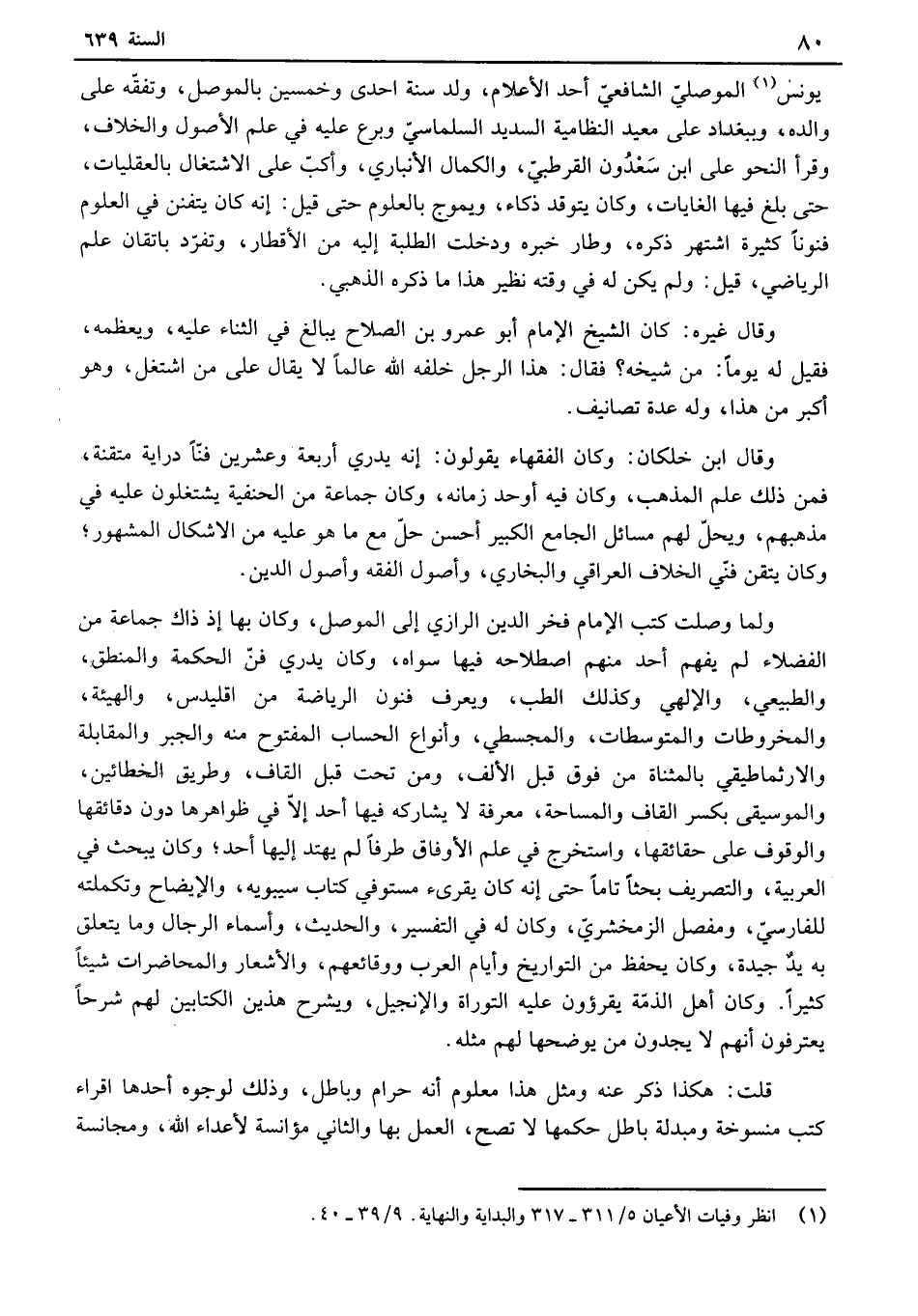يونس الموصلي الشافعي أحد الأعلام ولد سنة احدى وخمسين بالموصل، وتفقه على والده، وببغداد على معيد النظامية السديد السلماسي وبرع عليه في علم الأصول والخلاف، وقرأ النحو على ابن سعدون القرطبي، والكمال الأنباري، وأكب على الاشتغال بالعقليات، حتى بلغ فيها الغايات، وكان يتوقد ذكاء، ويموج بالحلوم حتى قيل: إنه كان يتفنن في العلوم فنونًا كثيرة اشتهر ذكره، وطار خبره ودخلت الطلبة إليه من الأقطار، وتفرد باتقان علم الرياضي، قيل: ولم يكن له في وقته نظير هذا ما ذكره الذهبي.