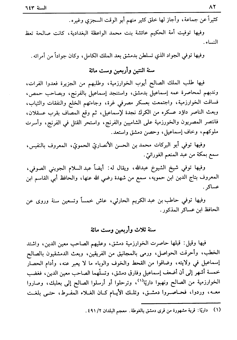 فيها وقيل: قبلها حاصرت الخوارزمية دمشق، وعليهم الصاحب معين الدين، واشتد الخطب، وأحرقت الحواصل، ورمى بالمجانيق من الفريقين، وبعث الدمشقيون بالصالح إسماعيل في ولايته، وضاقوا من القحط والخوف والوباء ما لا يعبر عنه، وأدام الحصار خمسة أشهر إلى أن أضعف إسماعيل وفارق دمشق، وتسفهما الصاحب معين الدين، فغضب الخوارزمية من الصالح ونهبوا داريا، وترحلوا أو أرسلوا الصالح إلى بعلبك، وصاروا معه، وردوا، فحاصروا دمشق، وتلك الأيام كان الغلاء المفرط، حتى بلغت