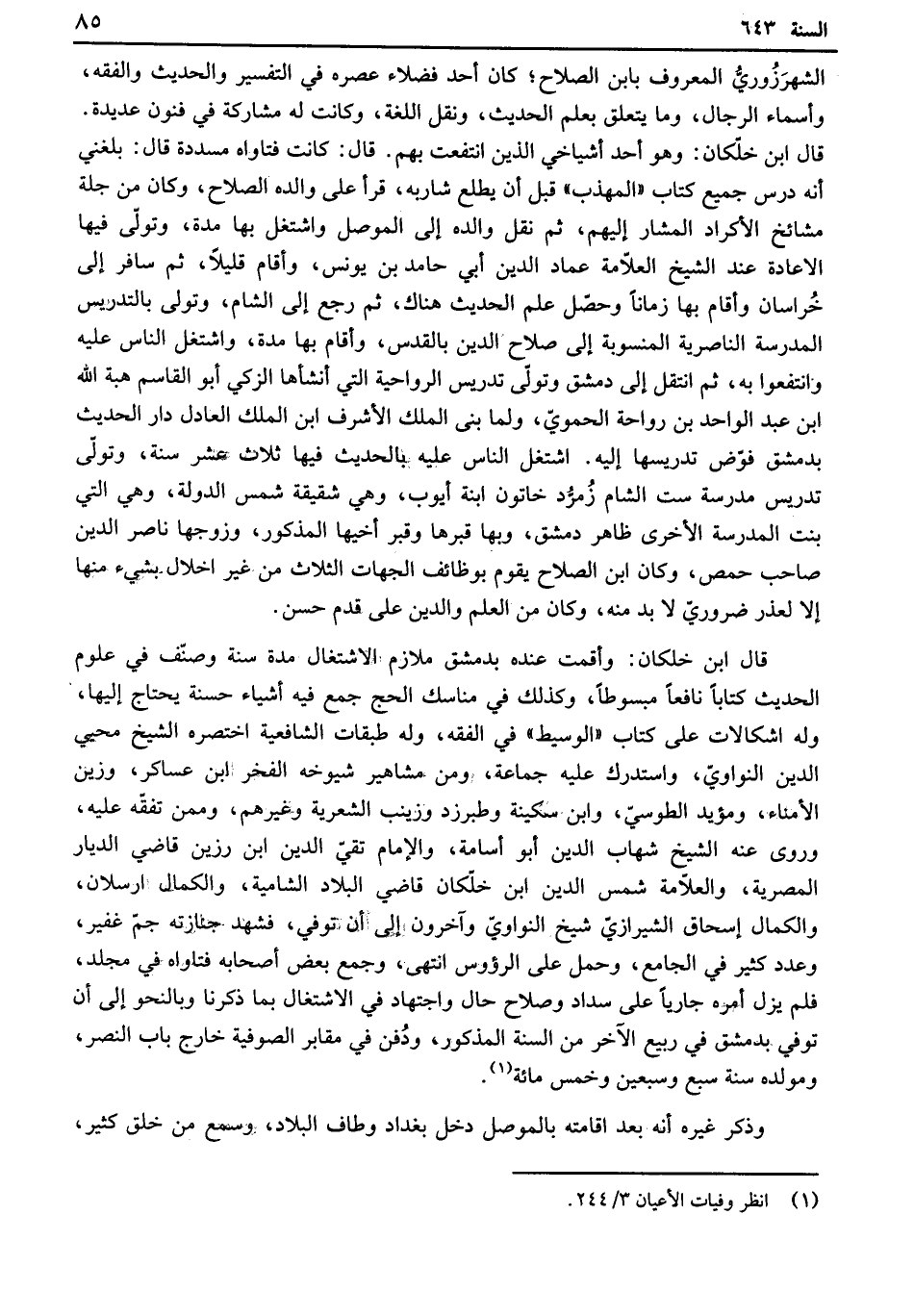 الشهرزوري المعروف بابن الصلاح كان أحد فضلاء عصره في التفسير والحديث والفقه، وأسماء الرجال، وما يتعلق بعلم الحديث، ونقل اللغة، وكانت له مشاركة في فنون عديدة. قال ابن خلكان: وهو أحد أشياخي الذين انتفعت بهم. قال: كانت فتاواه مسددة قال: بلغني أنه درس جميع كتاب المهذب قبل أن يطلع شاربه، قرأ على والده الصلاح، وكان من جلة مشائخ الأكراد المشار إليهم، ثم نقل والده إلى الموصل واشتغل بها مدة، وتولى فيها الإعادة عند الشيخ العلامة عماد الدين أبي حامد بن يونس، وأقام قليلاً، ثم سافر إلى خراسان وأقام بها زمانًا وحصل علم الحديث هناك، ثم رجع إلى الشام، وتولى بالتدريس المدرسة الناصرية المنسوبة إلى صلاح الدين بالقدس، وأقام بها مدة، واشتغل الناس عليه وانتفعوا به، ثم انتقل إلى دمشق وتولى تدريس الرواحية التي أنشأها الزكي أبو القاسم هبة الله ابن عبد الواحد بن رواحة الحموي، ولما بنى الملك الأشرف ابن الملك العادل دار الحديث بدمشق فوض تدريسها إليه. اشتغل الناس عليه بالحديث فيها ثلاث عشر سنة، وتولى تدريس مدرسة ست الشام زمرد خاتون ابنة أيوب، وهي شقيقة شمس الدولة، وهي التي بنت المدرسة الأخرى ظاهر دمشق، وبها قبرها وقبر أخيها المذكور، وزوجها ناصر الدين صاحب حمص، وكان ابن الصلاح يقوم بوظائف الجهات الثلاث من غير إخلال بشيء منها إلا لعذر ضروري لا بد منه، وكان من العلم والدين على قدم حسن.