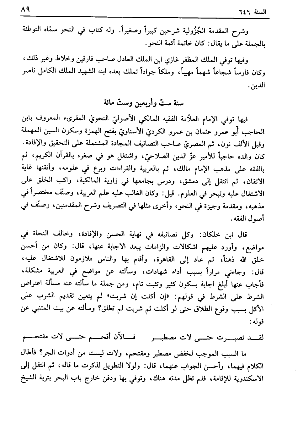 فيها توفي الإمام العلامة الفقيه المالكي الأصولي النحوي المقرىء المعروف بابن الحاجب أبو عمرو عثمان بن عمرو الكردي الأسناوي بفتح الهمزة وسكون السين المهملة وقبل الألف نون، ثم المصري صاحب التصانيف المجادة المشتملة على التحقيق والإفادة. كان والده حاجباً للأمير عز الدين الصلاحي، واشتغل هو في صغره بالقران الكريم، ثم بالفقه على مذهب الإمام مالك، ثم بالعربية والقراءات وبرع في علومه، وأتقنها غاية الإتقان، ثم انتقل إلى دمشق، ودرس بجامعها في زاوية المالكية، واكب الخلق على الاشتغال عليه وتبحر في العلوم. قيل: وكان الغالب عليه علم العربية، وصنف مختصرًا في مذهبه، ومقدمة وجيزة في النحو، وأخرى مثلها في التصريف وشرح المقدمتين، وصنف في أصول الفقه.