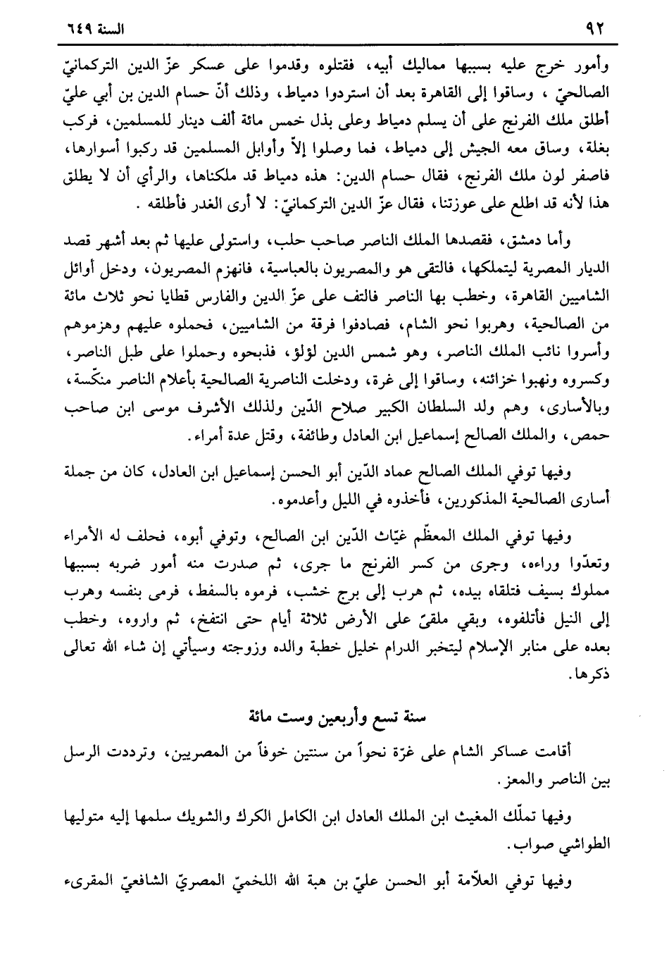 وفيها توفي الملك الصالح عماد الدين أبوالحسن إسماعيل ابن العادل، كان من جملة أسارى الصالحية المذكورين، فأخذوه في الليل وأعدموه.
