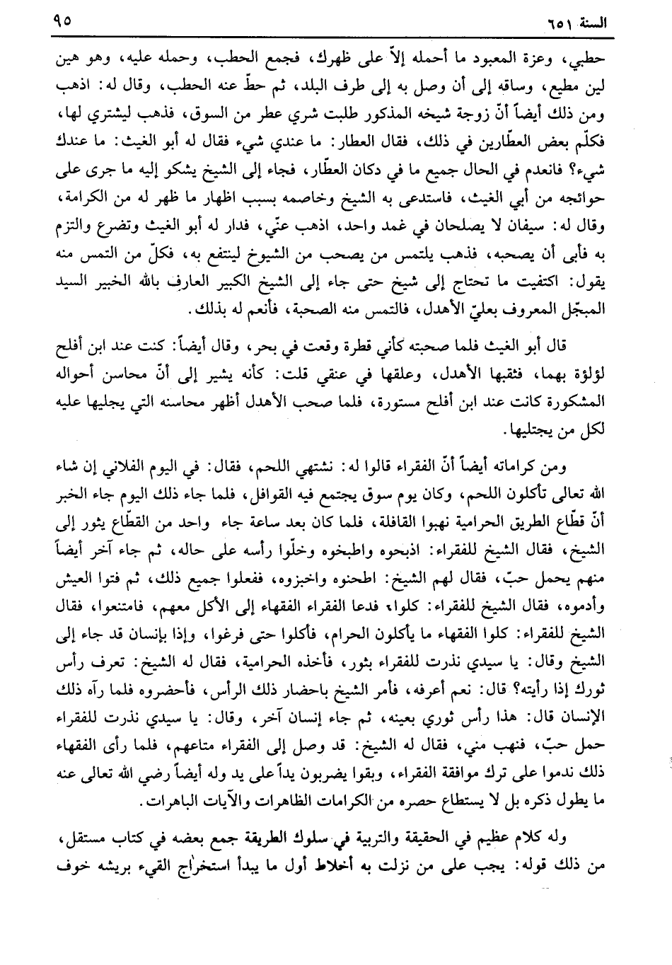 الله تعالى تكلون اللحم، وكان يوم سوق يجتمع فيه القوافل، فلما جاء ذلك اليوم جاء الخبر أن قطاع الطريق الحرامية نهبوا القافلة، فلما كان بعد ساعة جاء واحد من القطاع يثور إلى الشيخ، فقال الشيخ للفقراء: اذبحوه واطبخوه وخلوا رأسه على حاله، ثم جاء آخر أيضاً منهم يحمل حب، فقال لهم الشيخ: اطحنوه واخبزوه، ففعلوا جميع ذلك، ثم فتوا العيش وأدموه، فقال الشيخ للفقراء: كلوا، فدعا الفقراء الفقهاء إلى الأكل معهم، فامتنعوا، فقال الشيخ للفقراء: كلوا الفقهاء ما يكلون الحرام، فأكلوا حتى فرغوا، وإذا بإنسان قد جاء إلى الشيخ وقال: يا سيدي نذرت للفقراء بثور، فأخذه الحرامية، فقال له الشيخ: تعرف رأس ثورك إذا رأيته. قال: نعم أعرفه، فأمر الشيخ بإحضار ذلك الرأس، فأحضروه فلما رآه ذلك الإنسان قال: هذا رأس ثوري بعينه، ثم جاء إنسان آخر، وقال: يا سيدي نذرت للفقراء حمل حب، فنهب مني، فقال له الشيخ: قد وصل إلى الفقراء متاعهم، فلما رأى الفقهاء ذلك ندموا على ترك موافقة الفقراء، وبقوا يضربون يدا على يد وله أيضا رضي الله تعالى عنه ما يطول ذكره بل لا يستطاع حصره من الكرامات الظاهرات والآيات الباهرات.