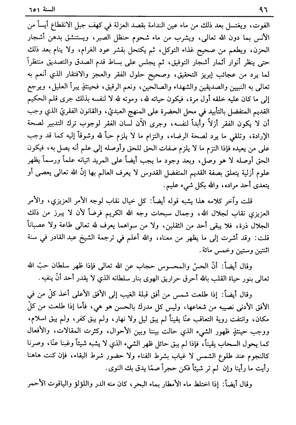 قلت وآخر كلامه هذا يشبه قوله أيضأ: كل خيال نقاب لوجه الأمر العزيزي، والأمر العزيزي نقاب لجلال الله، وجمال سبحات وجه الله الكريم فرضًا لأن لايبرز من ذلك الجلال ذرة، فلا يبقى أحد من الثقلين، ولا من سواهما يعرف لله تعالى طاعة ول اعصيانًا قلت: وقد أشرت إلى ما يظهر من معناه، والله أعلم في ترجمة الشيخ عبد القادر في سنة اثنتين وستين وخمس مائة.