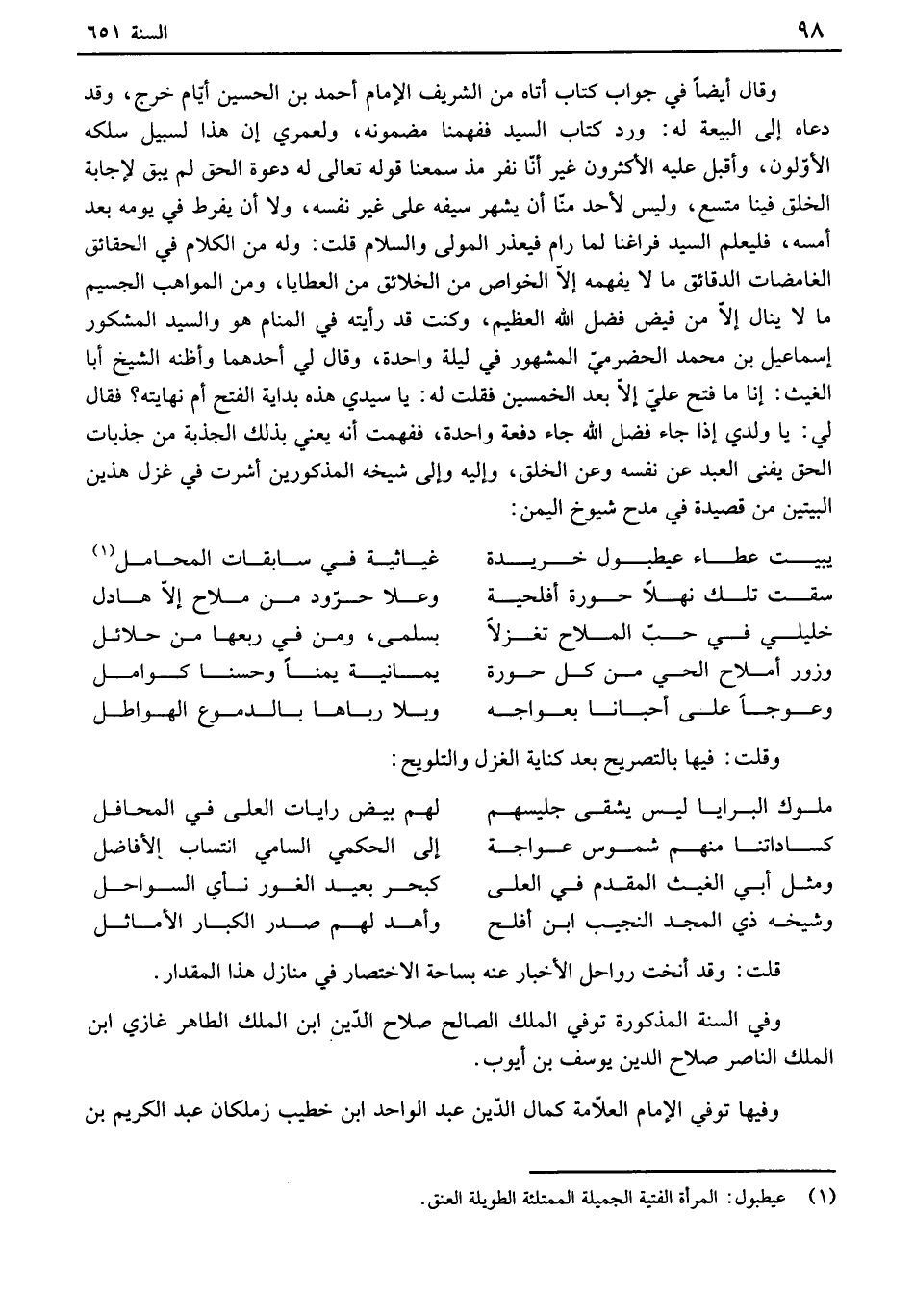 وقال أيضاً في جواب كتاب أتاه من الشريف الإمام أحمد بن الحسين أيام خرج، وقد دعاه إلى البيعة له: ورد كتاب السيد ففهمنا مضمونه، ولعمري إن هذا سلكه الأولون، وأقبل عليه الأكثرون غير أنا نفر مذ سمعنا قوله تعالى له دعوة الحق لم يبق لإجابة الخلق فينا متسع، وليس لأحد منا أن يشهر سيفه على غير نفسه، ولا أن يفرط في يومه بعد أمسه، فليعلم السيد فراغنا لمارام فيعذر المولى والسلام قلت: وله من الكلام في الحقائق الغامضات الدقائق ما لا يفهمه إلا الخواص من الخلائق من العطايا، ومن المواهب الجسيم ما لا ينال إلا من فيض فضل الله العظيم، وكنت قد رأيته في المنام هو والسيد المشكور إسماعيل بن محمد الحضرمي المشهور في ليلة واحدة، وقال لي أحدهما وأظنه الشيخ أبا الغيث: إنا ما فتح علي إلا بعد الخمسين فقلت له: يا سيدي هذه بداية الفتح أم نهايته؟ فقال لي: يا ولدي إذا جاء فضل الله جاء دفعة واحدة، ففهمت أنه يعني بذلك الجذبة من جذبات الحق يفنى العبد عن نفسه وعن الخلق، وإليه وإلى شيخه المذكورين أشرت في غزل هذين البيتين من قصيدة في مدح شيوخ اليمن: