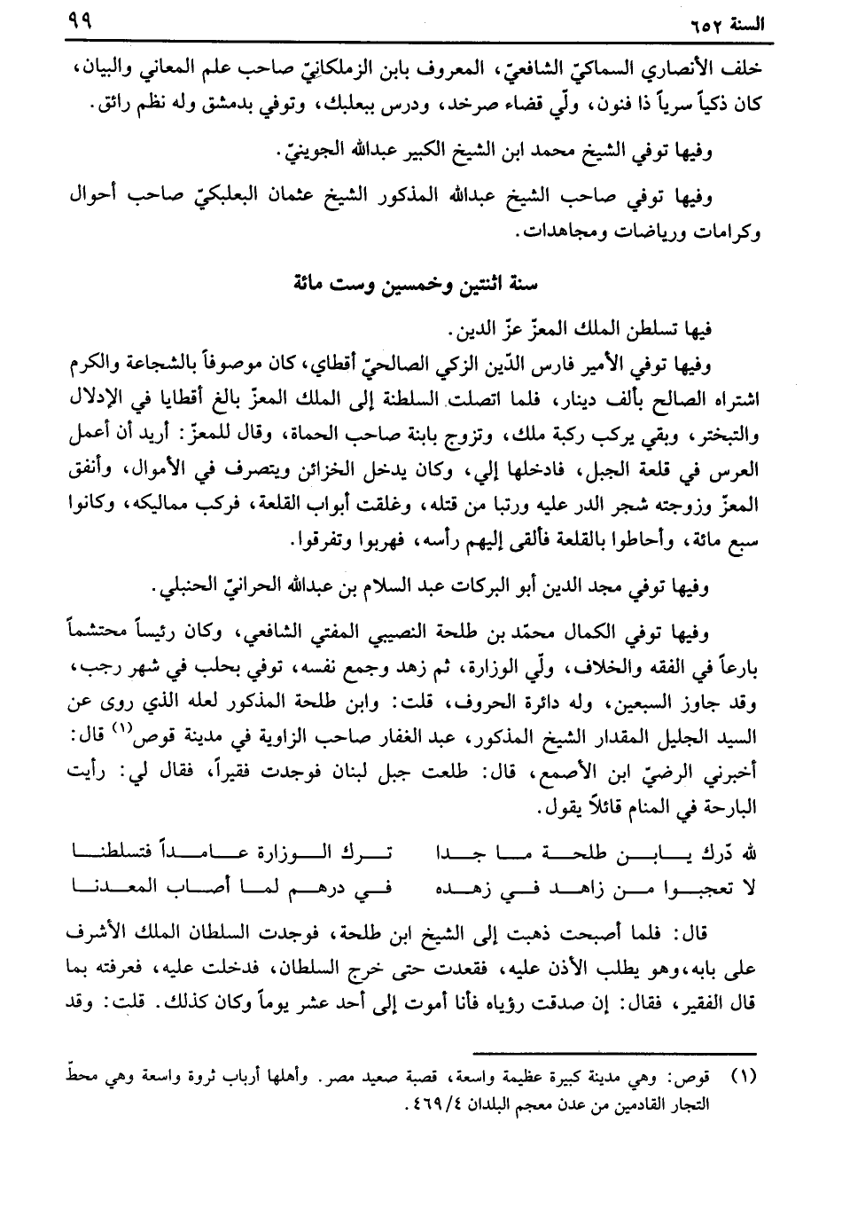 وفيها توفي الكمال محمد بن طلحة النصيبي المفتي الشافعي، وكان رئيساً محتشماً بارعاً في الفقه والخلاف، ولي الوزارة، ثم زهد وجمع نفسه، توفي بحلب في شهر رجب، وقد جاوز السبعين، وله دائرة الحروف، قلت: وابن طلحة المذكور لعله الذي روى السيد الجليل المقدار الشيخ المذكور، عبد الغفار صاحب الزاوية في مدينة قوص قال أخبرني الرضي ابن الأصمع، قال: طلعت جبل لبنان فوجدت فقيراً، فقال لي: رأيت البارحة في المنام قائلاً يقول.