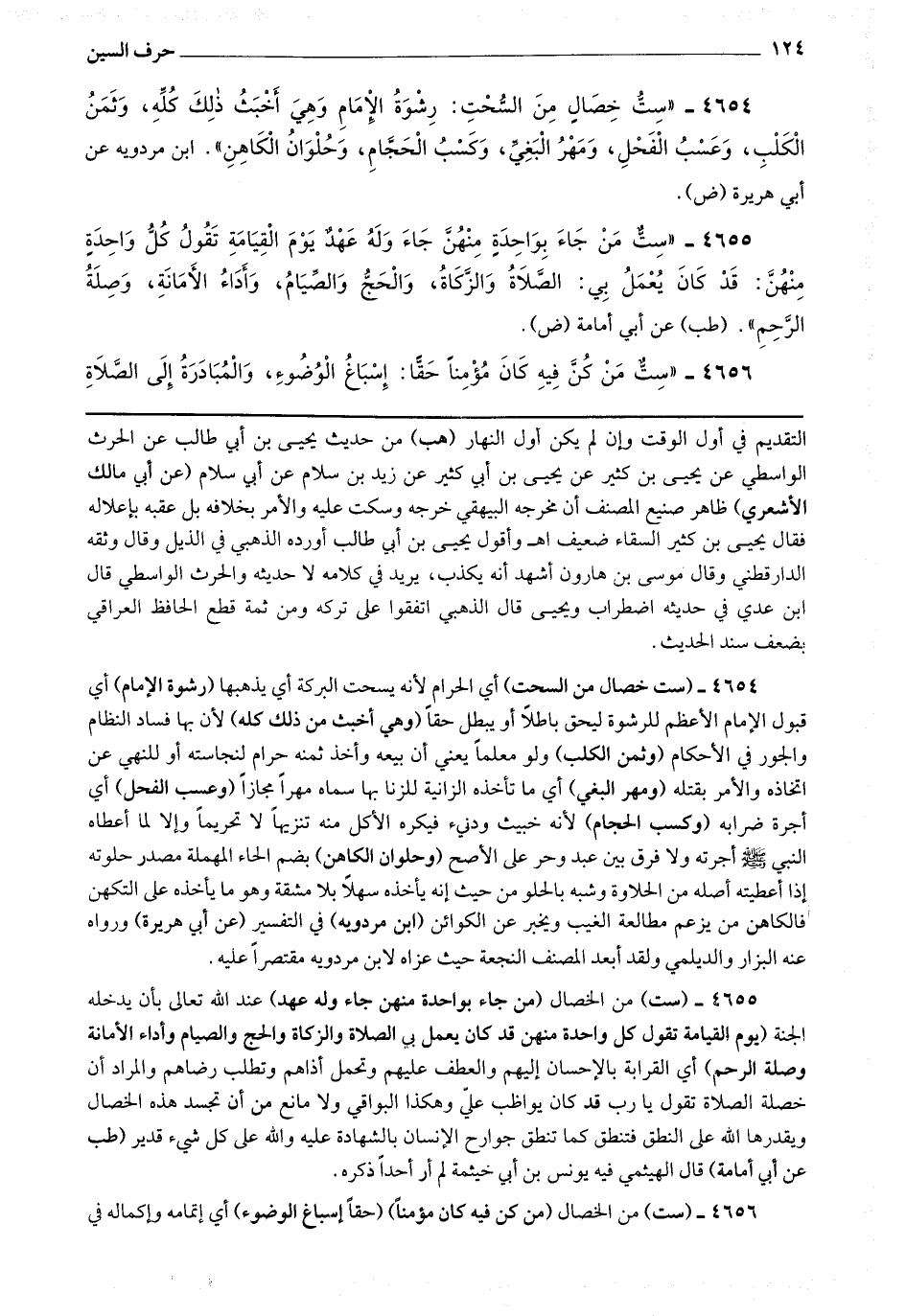 4654 - (ست خصال من السحت) أي الحرام لأنه يسحت البركة أي يذهبها (رشوة الإمام) أي قبول الإمام الأعظم للرشوة ليحق باطلا أو يبطل حقا (وهي أخبث من ذلك كله) لأن بها فساد النظام