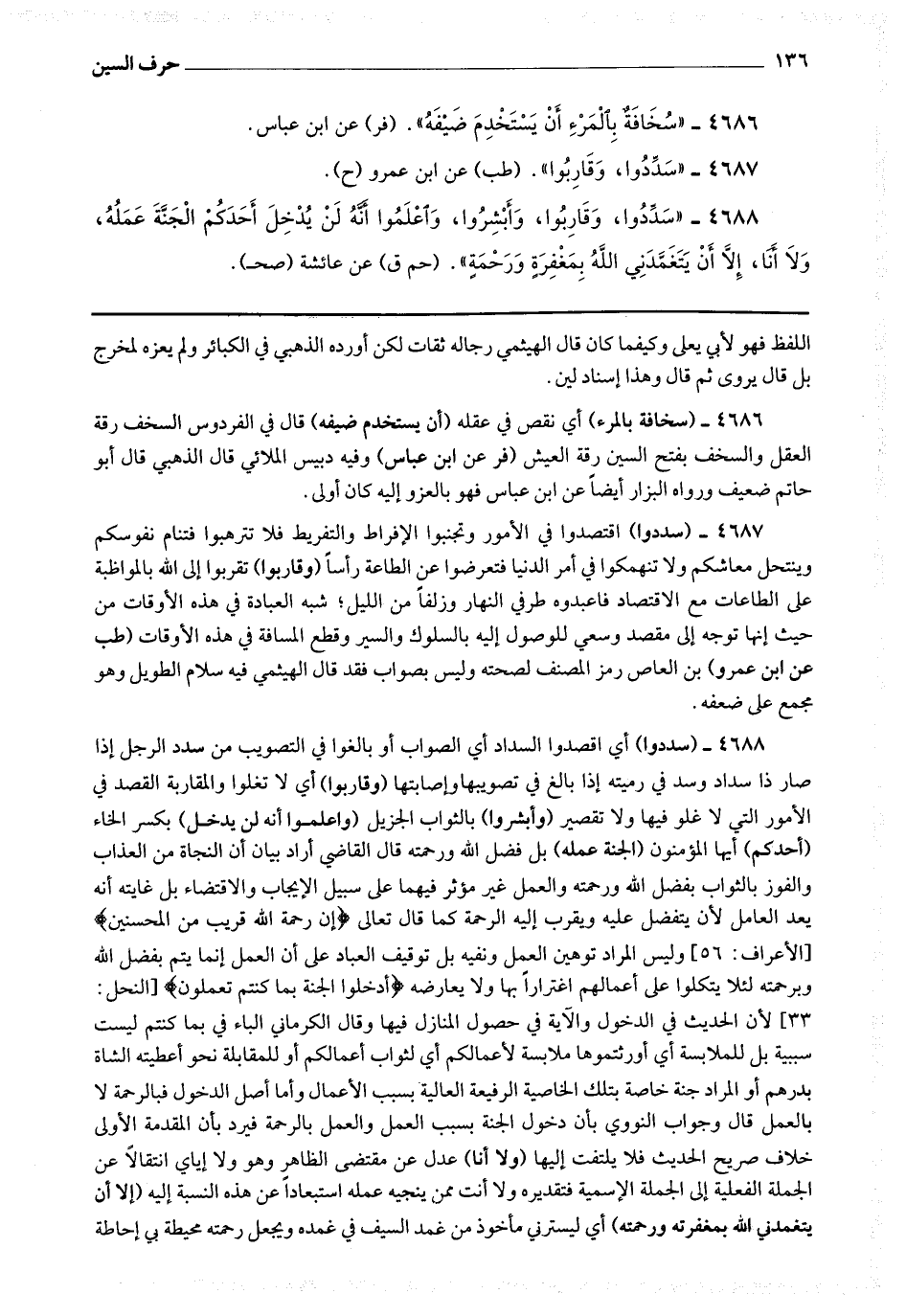 4687 - (سددوا) اقتصدوا في الأمور وتجنبوا الإفراط والتفريط فلا تترهبوا فتنام نفوسكم وينتحل معاشكم ولا تنهمكوا في أمر الدنيا فتعرضوا عن الطاعة رأسا (وقاربوا) تقربوا إلى الله بالمواظبة على الطاعات مع الاقتصاد فاعبدوه طرفي النهار وزلفا من الليل ، شبه العبادة في هذه الأوقات من حيث أنها توجه إلى مقصد وسعي للوصول إليه بالسلوك والسير وقطع المسافة في هذه الأوقات.