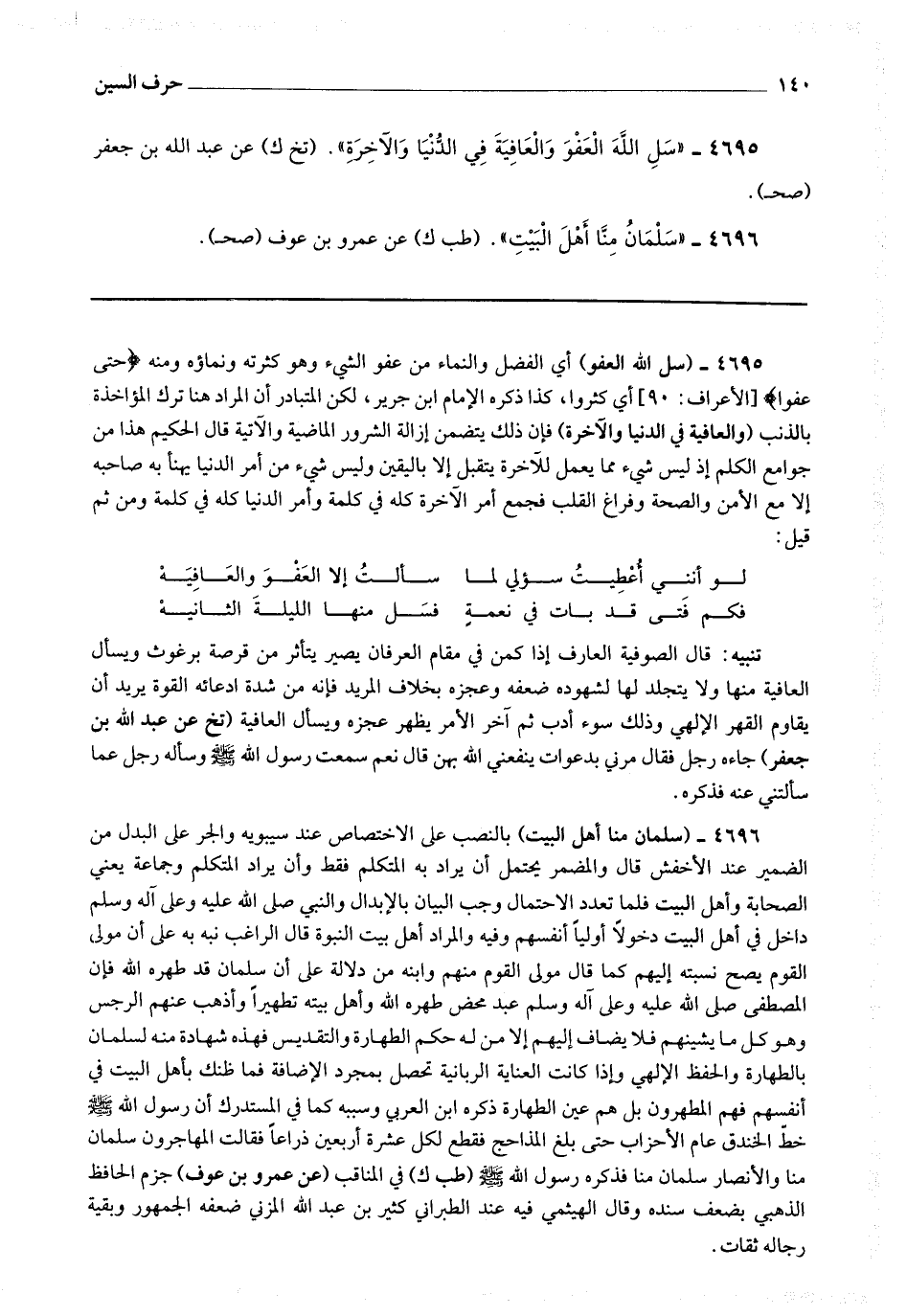 4695 - (سل الله العفو) أي الفضل والنماء من عفو الشئ وهو كثرته ونماؤه ومنه * (حتى عفوا) * أي كثروا ، كذا ذكره الإمام ابن جرير ، لكن المتبادر أن المراد هنا ترك المؤاخذة