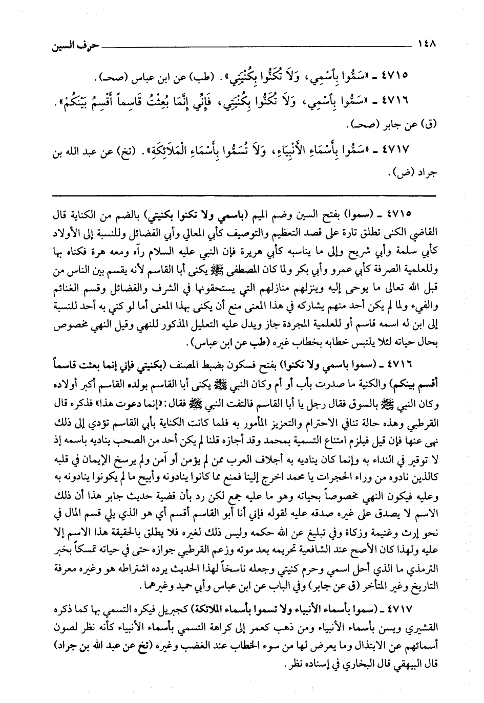 4717 - (سموا بأسماء الأنبياء ولا تسموا بأسماء الملائكة) كجبريل فيكره التسمي بها كما ذكره القشيري ويسن بأسماء الأنبياء ومن ذهب كعمر إلى كراهة التسمي بأسماء الأنبياء كأنه نظر لصون أسمائهم عن الابتذال وما يعرض لها من سوء الخطاب عند الغضب وغيره.